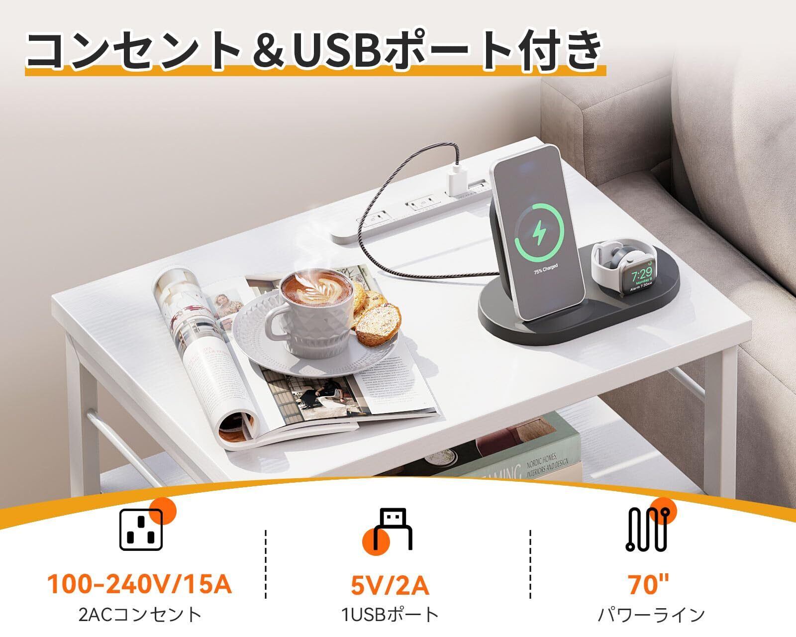 KKL サイドテーブル ナイトテーブル ベッドサイドテーブル コンセント付き 40×30×70cm 引き出し付き 収納付き ベッド横 ホワイト