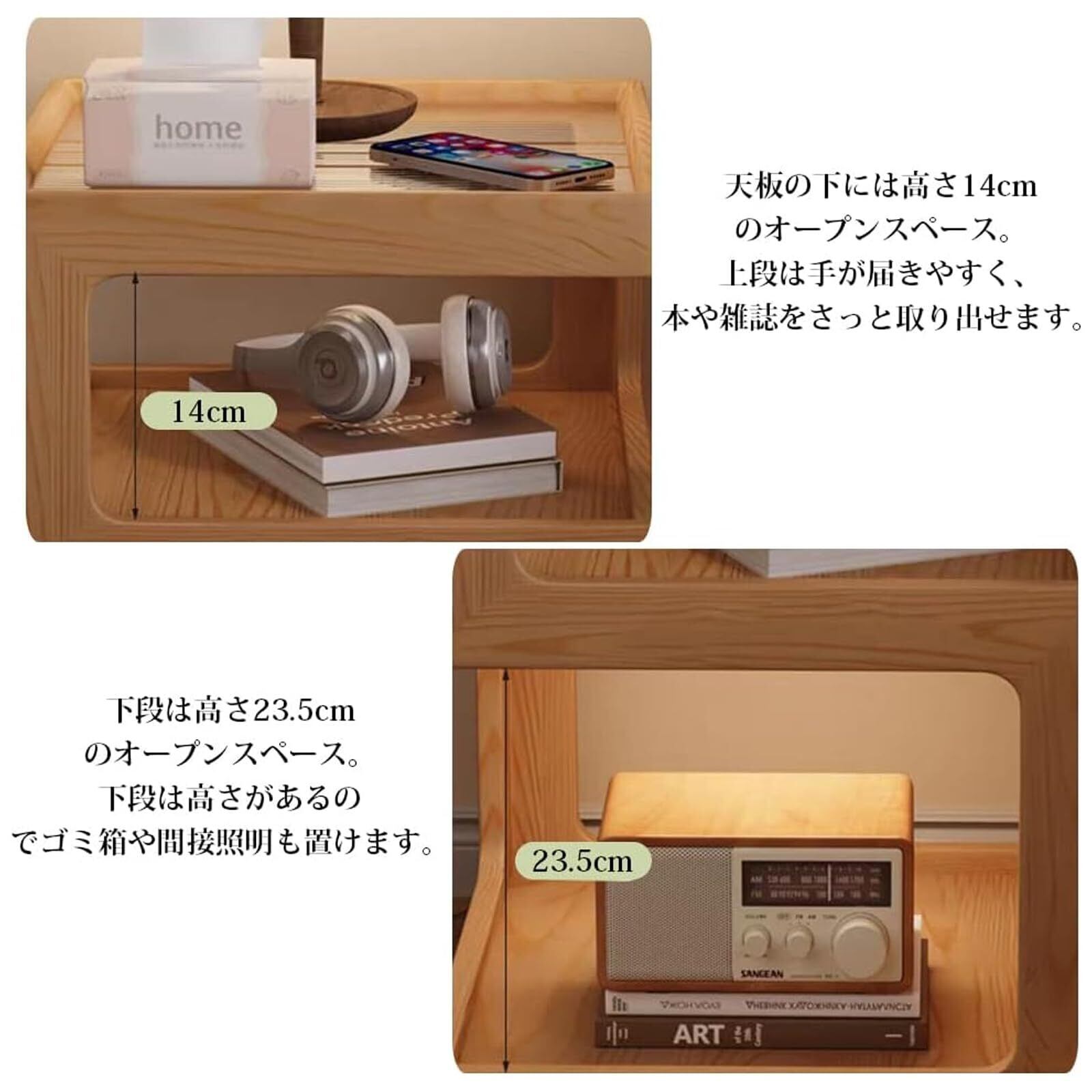 【十分な収納スペース】天板の下には高さ14cmのオープンスペース。上段は手が届きやすく、本や雑誌をさっと取り出せます。下段は高さ23.5cmのオープンスペース。下段は高さがあるのでゴミ箱や間接照明も置けます。