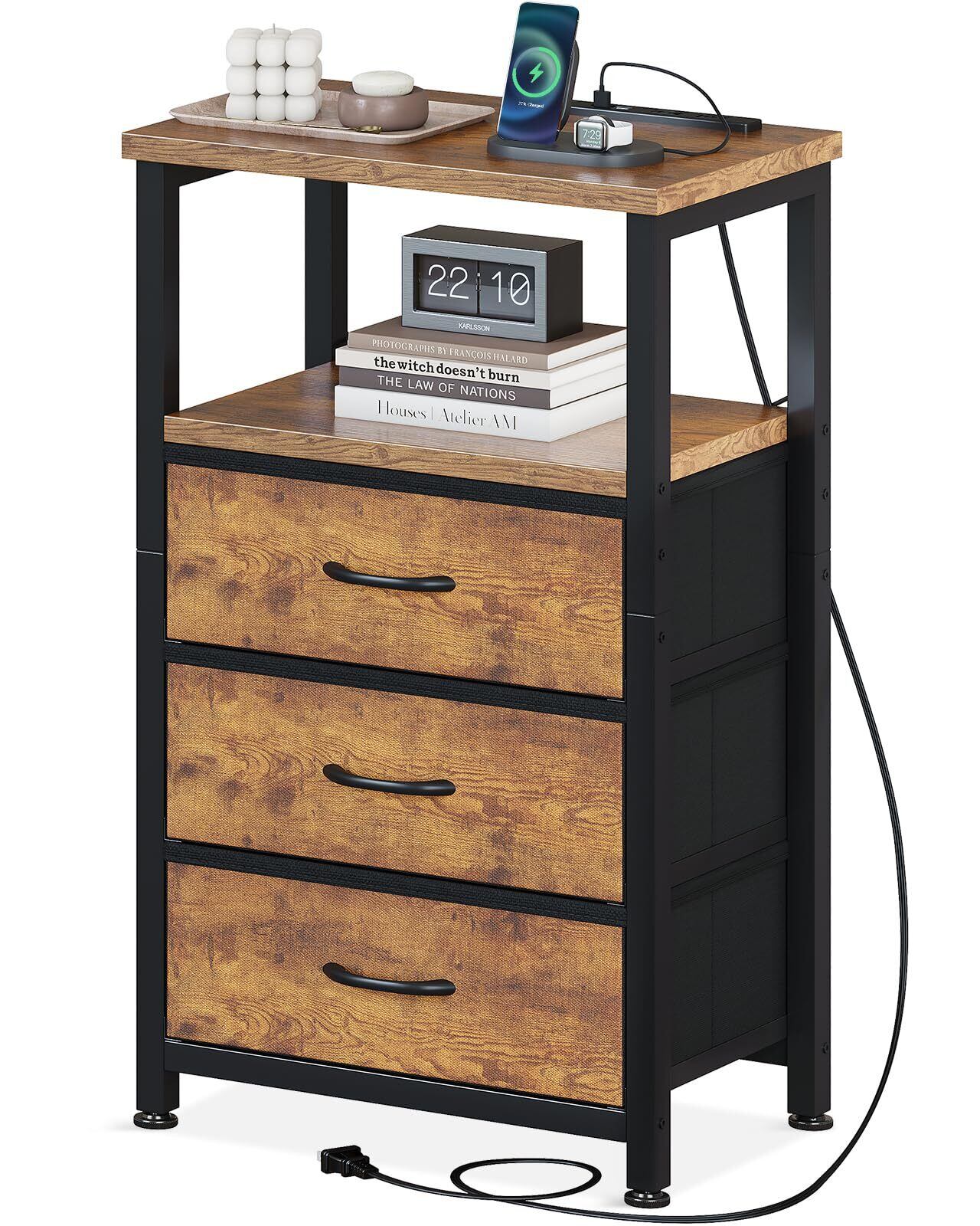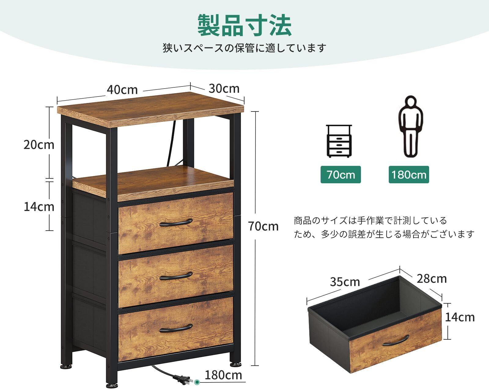 AODK サイドテーブル ナイトテーブル ベッドサイドテーブル コンセント付き 40×30×70cm 引き出し付き ベッド横 (ビンテージ)