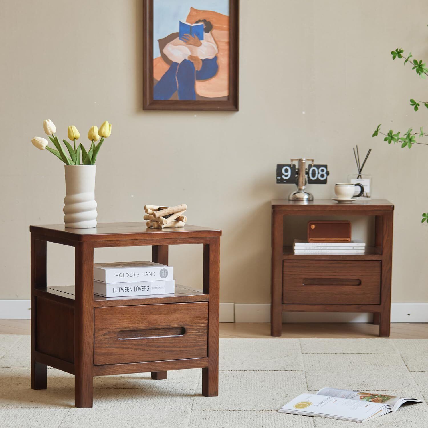 ベッドサイドテーブル アメリカオークウッド ナイトテーブル ライトスタンド モダンなインテリア 木製 無垢材 完成品 ソファスタンドエンド ランプテーブル 引き出し付き 小物収納 幅45cmx奥37cmx高さ49cm DBR色