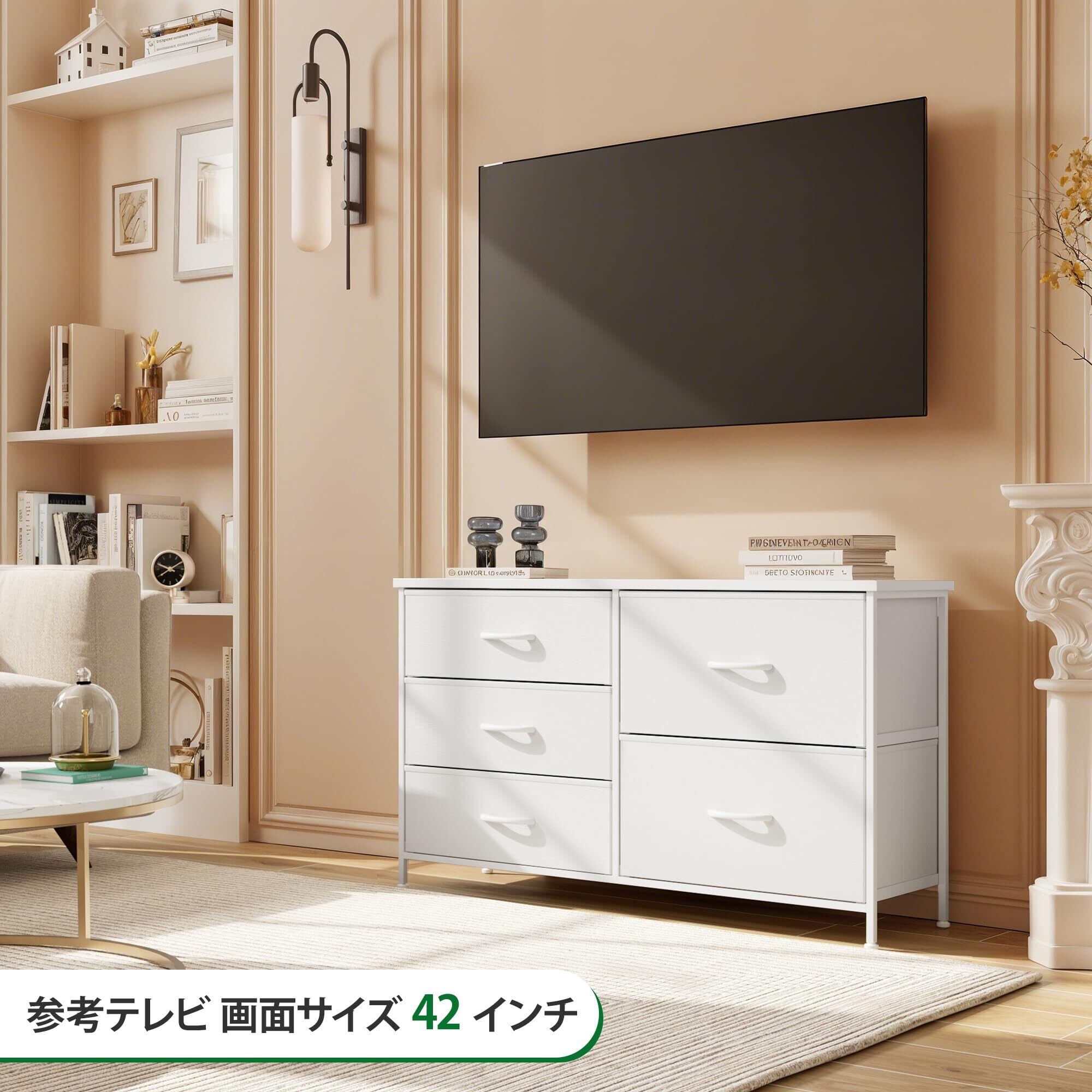 【すごい収納力】チェストには、折りたたみ可能な大きな引き出しが5つ付いており、様々な収納ニーズにお応えします。深くて広い引き出しは、毛布、スカーフ、靴下、お子様のおもちゃや衣類をたっぷり収納できます。また、リビングチェストの木製の天板は、時計、写真、ランプ、CDなど、よく使うものを置くのに適した硬い表面になっています。