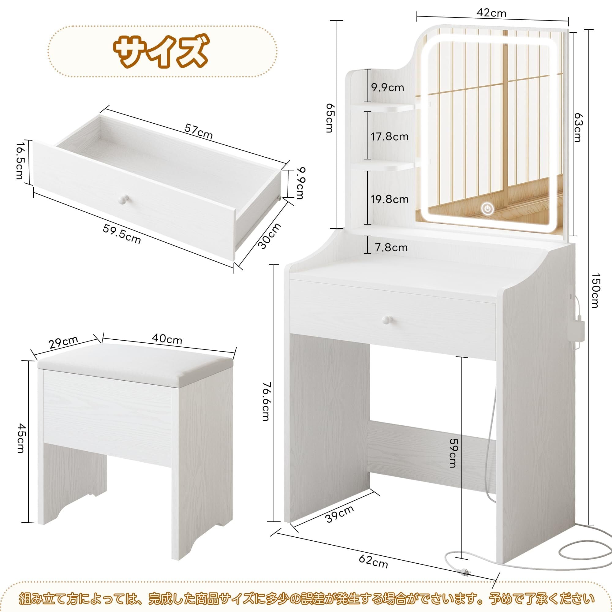 LIKIMIO ドレッサー コンパクト 幅62CM コンセント付き 3色LEDライト 収納スツール付き 鏡台 収納沢山 女優ミラー 可愛い 引き出し収納 ミニドレッサー 化粧台 ホワイト