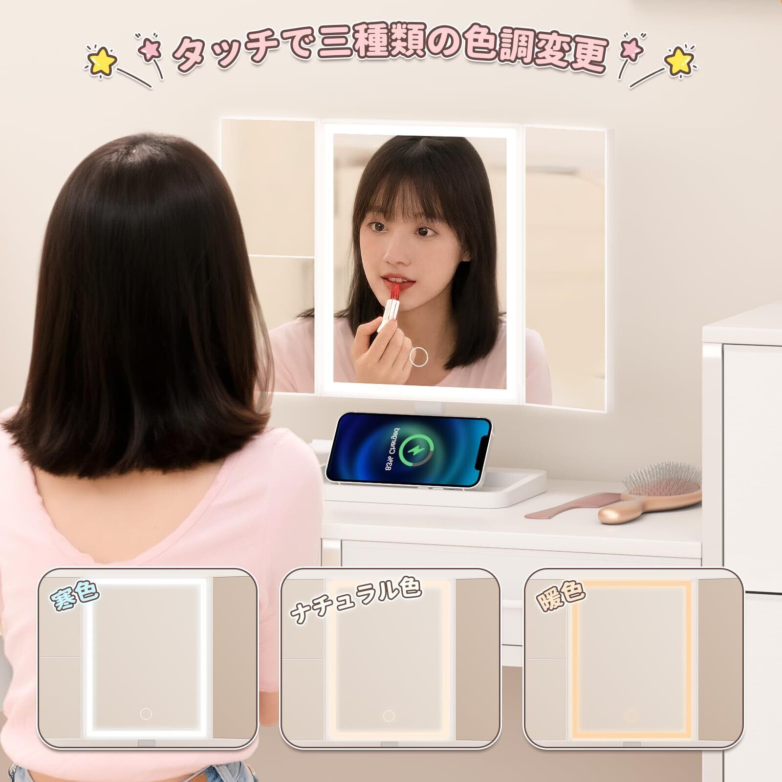【三面折りたたみ式ミラーでメイクがもっと快適に】中央ミラーには3色切替&無段階調光が可能なLEDライトを搭載。時間帯や部屋の明るさに応じて最適な光を選べます。さらに180度回転、90度チルト機能付き。ミラーを折りたためばすっきり収納でき、使わない時も邪魔になりません。左側のミラーは2倍と3倍の拡大鏡仕様で、アイメイクや毛穴のチェックなど細かな作業にぴったり。