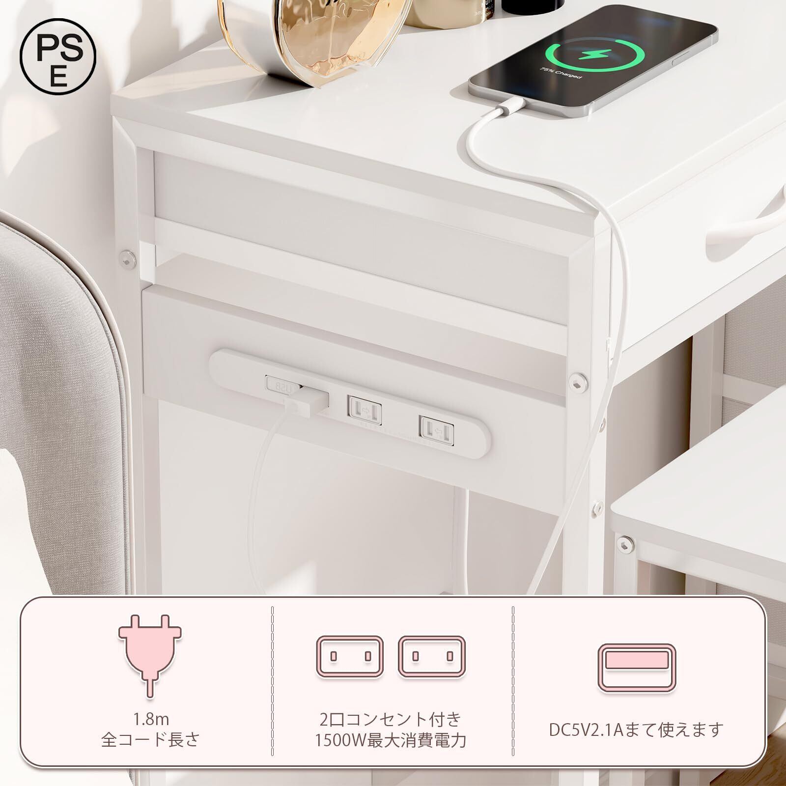 【コンセント&USBポート付きで便利に使える】右下のフレームには2口コンセントとUSBポートを搭載。スマホの充電はもちろん、ヘアアイロンやドライヤーの使用もOK。わざわざ延長コードを引かなくても済むので、朝の準備やナイトルーティンがより快適に。