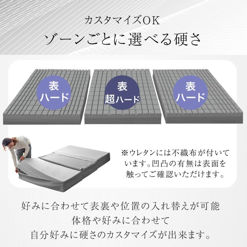 【素材】中材: 【上層/プロファイル面】高反発ウレタンフォーム(35D、250N、反発弾性45%) 【中層】高反発ウレタンフォーム(30D、220N、反発弾性40%) 【下層/平面】高反発ゼロ-Gフォーム(50D、80N、反発弾性42%)側生地:ニット、メッシュ(ポリエステル100%)インナーカバー:ポリエステル100%