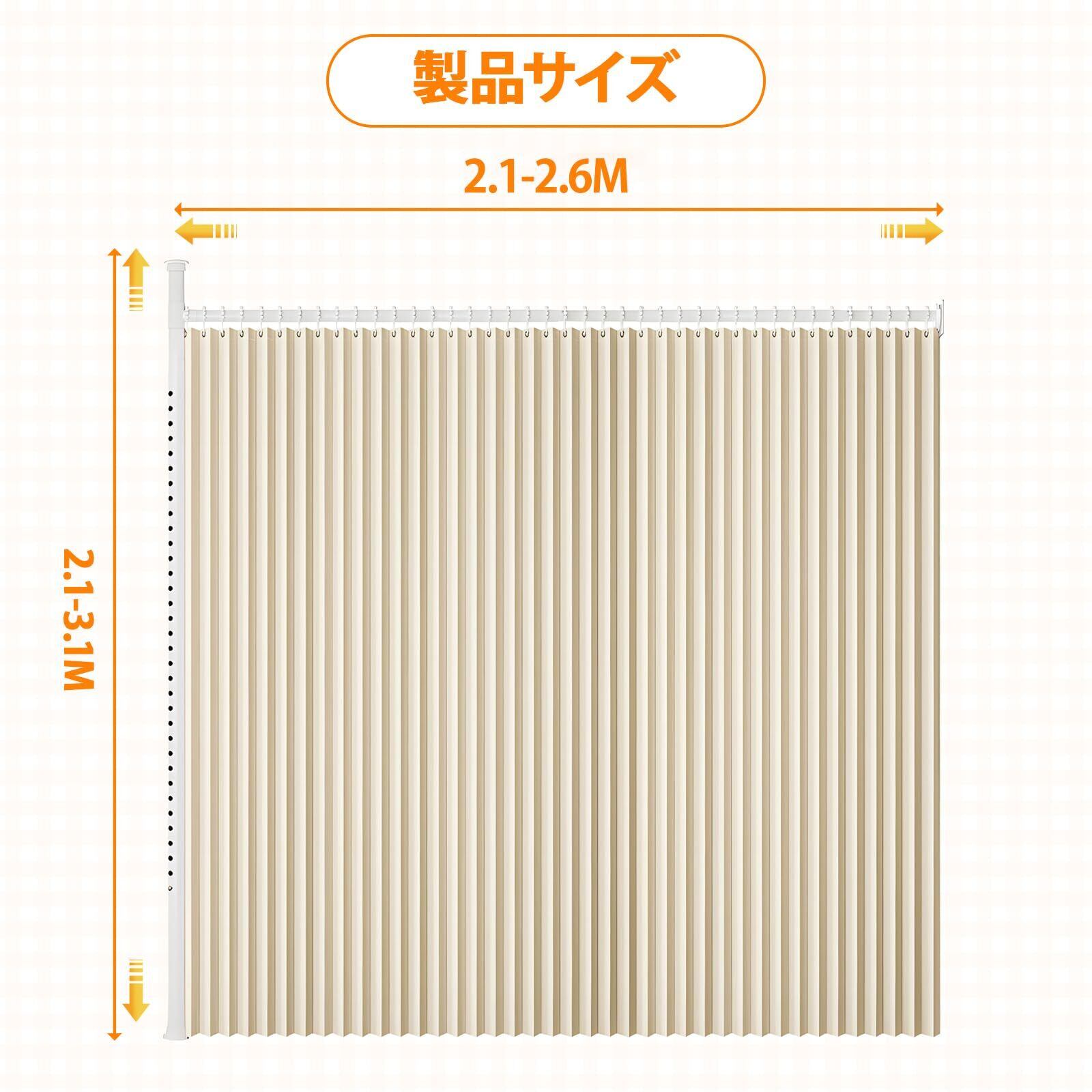 【幅広いサイズ対応】メインのみ:110~160cm; メイン+延長棒(短):160-210cm; メイン+延長棒(長):210-260cm; メイン+延長棒(短)+延長棒(長):260-310cm。伸縮自在で様々な部屋サイズにフィット。高さ調節も可能なため、異なる天井高にも対応します。