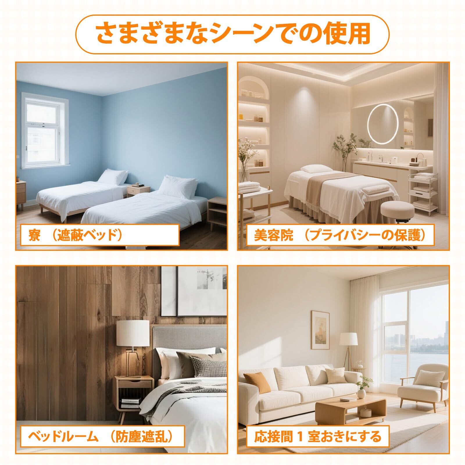 【さまざまなシーンでの活用】リビングではソファーエリアとダイニングエリアを仕切り、寝室では布団スペースをプライベートに区切ることができます。キッチンでは料理エリアの汚れを防ぎ、玄関では風除けとして機能します。夜勤者の昼寝時や、お子さんの勉強スペースを作るのにも最適です。