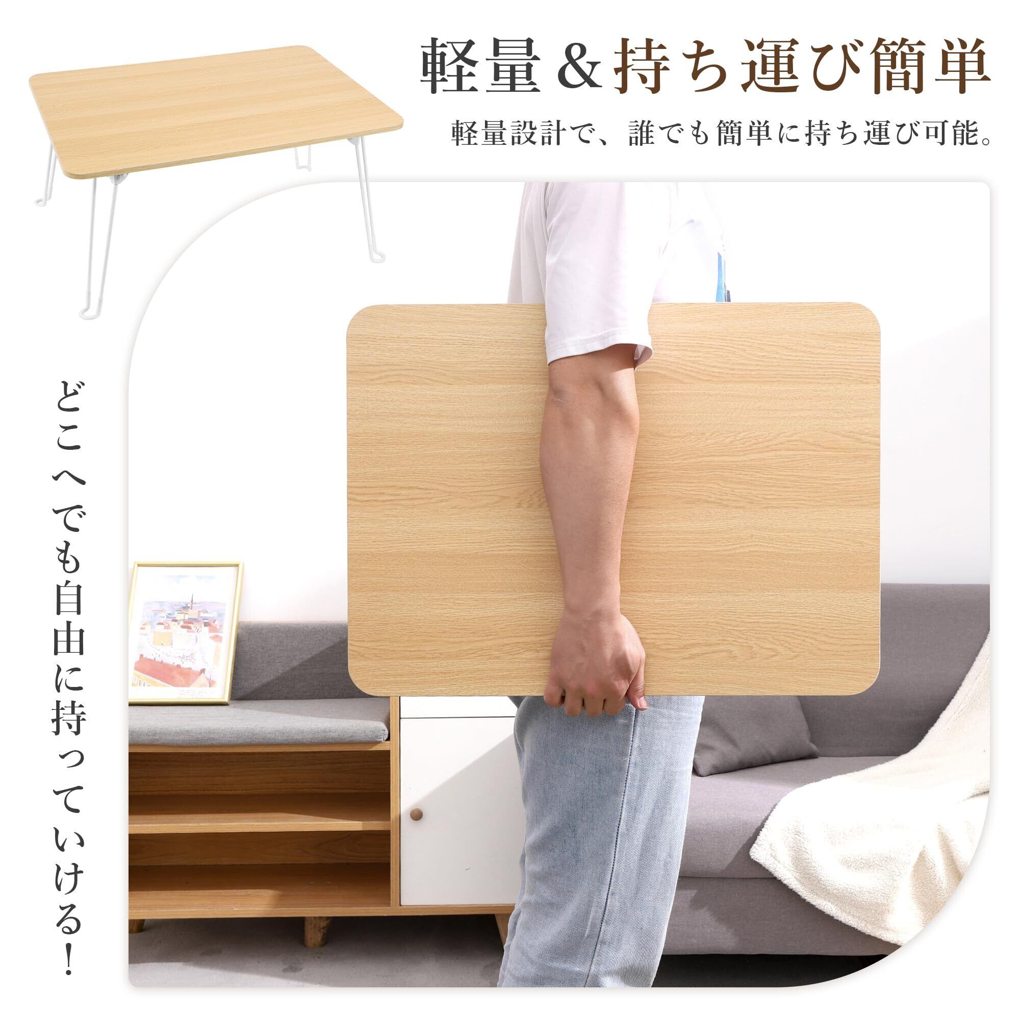 「便利な折りたたみ式の完成品ローテーブル」 こちらのローテーブルは、開けてすぐ使える完成品。ワンプッシュで簡単収納。折りたたんだ状態では厚さがわずか 4.5cm で、軽量設計で、誰でも簡単に持ち運び可能。どこへでも自由に持っていける!