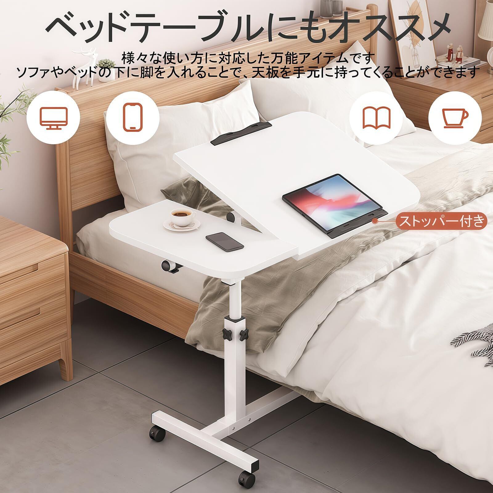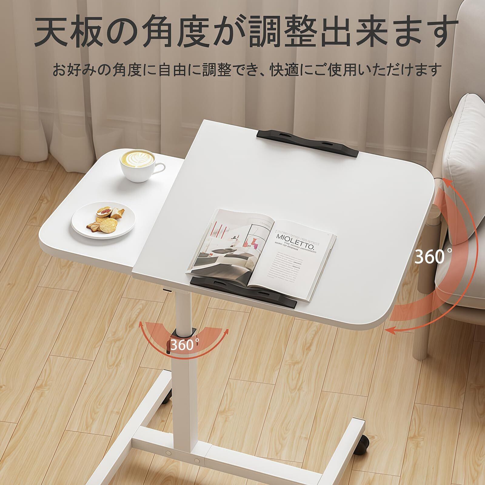 【天板角度調整可能】360°幅広い傾く範囲無段階調整可能、使いやすい角度でお使いいただけます。天板を傾けた時にノートパソコンやタブレット、雑誌などが落ちないようにストッパーが付いています。使用しない時は天板を折り畳みむことで圧迫感がなく収納しておけます。