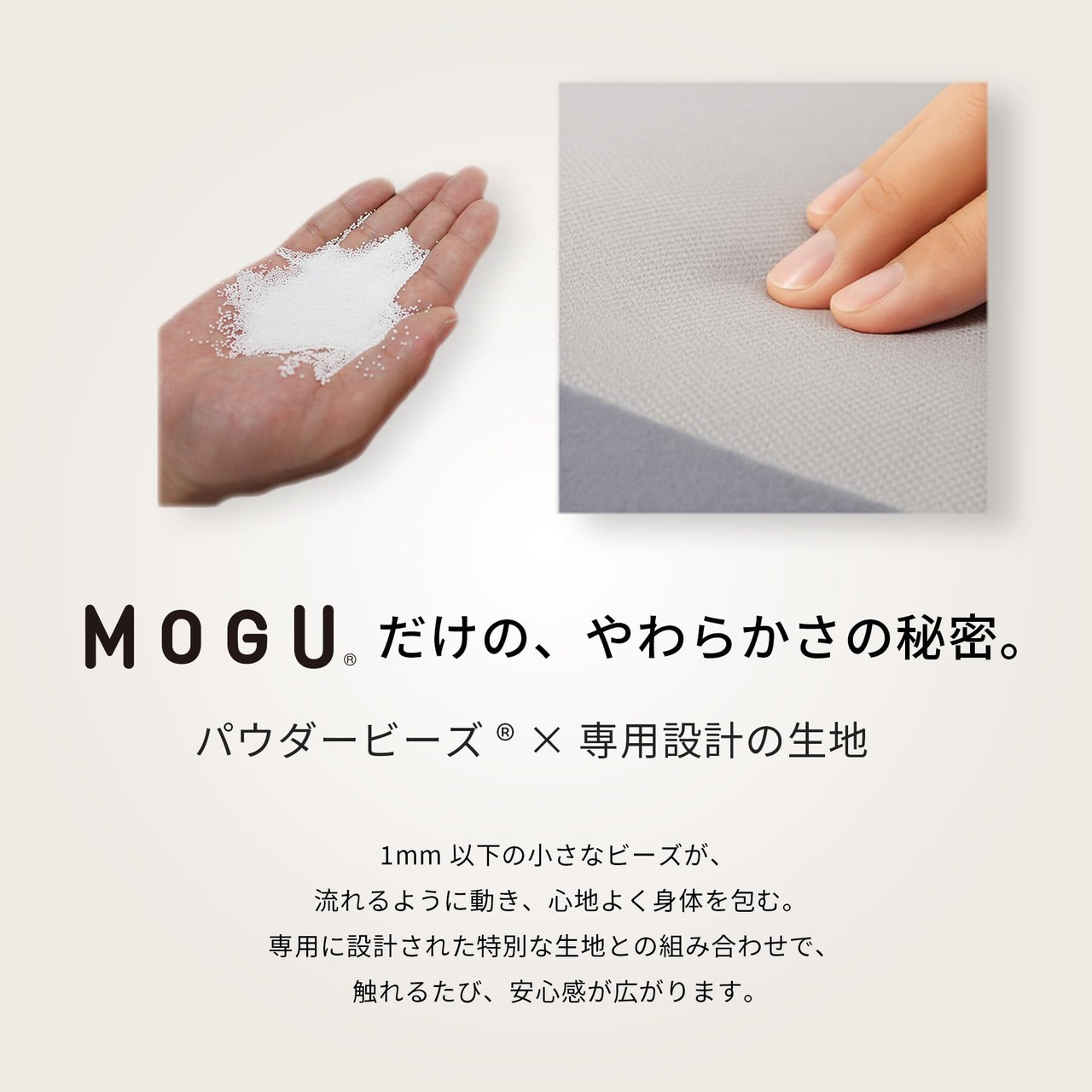 超微粒子ビーズで体にフィット;MOGU独自の超微粒子ビーズが、おしりや背中を優しく支え、理想の姿勢へ導きます。