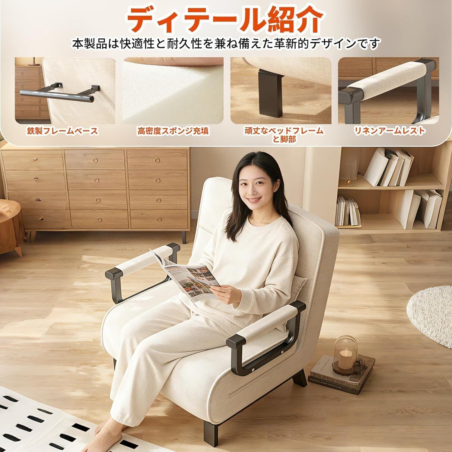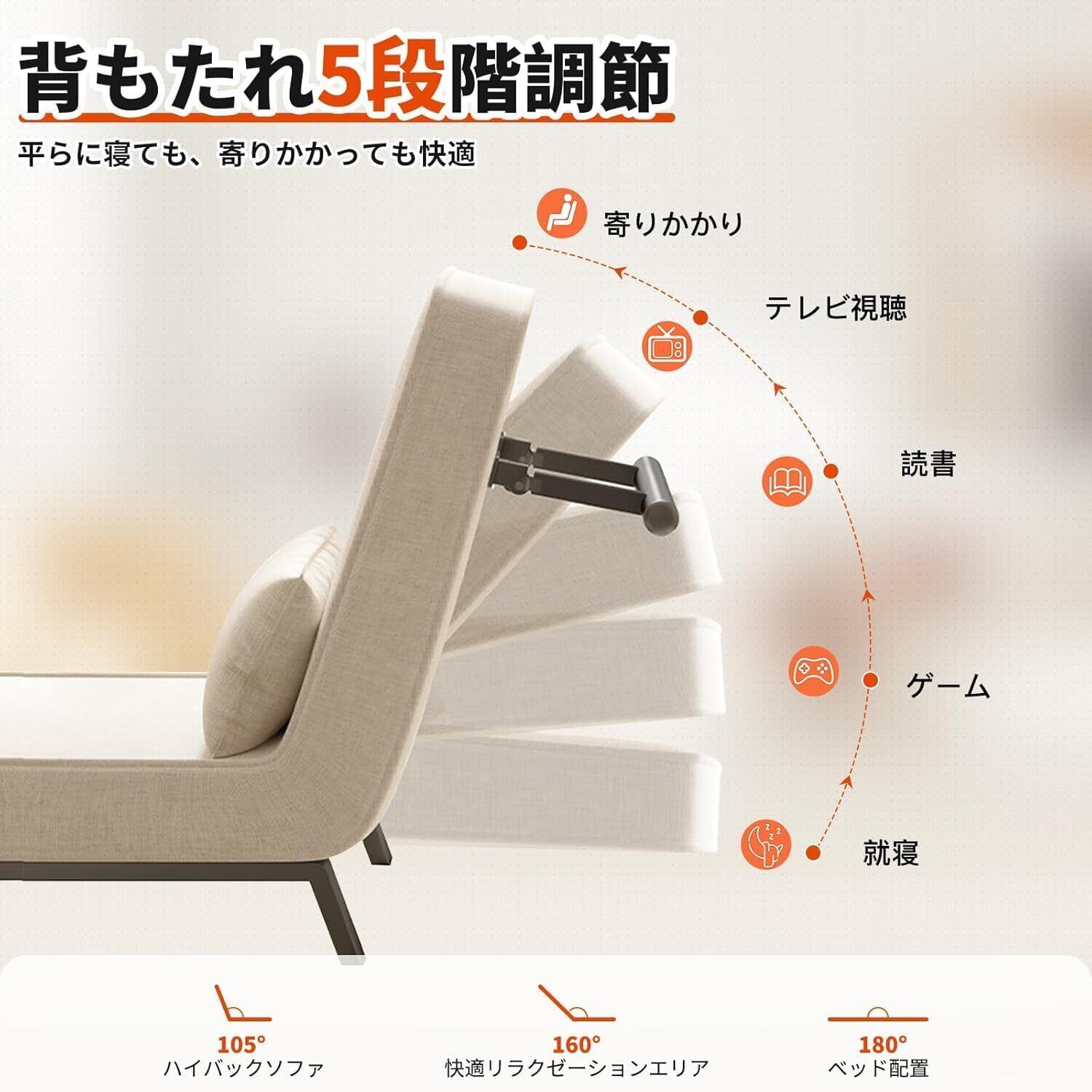 3WAYマルチ機能設計 - 普段使いソファ/リクライニングチェア/シングルベッドとして活用可能。厚みのある座面と適度な硬さの背もたれで腰部をしっかりサポート