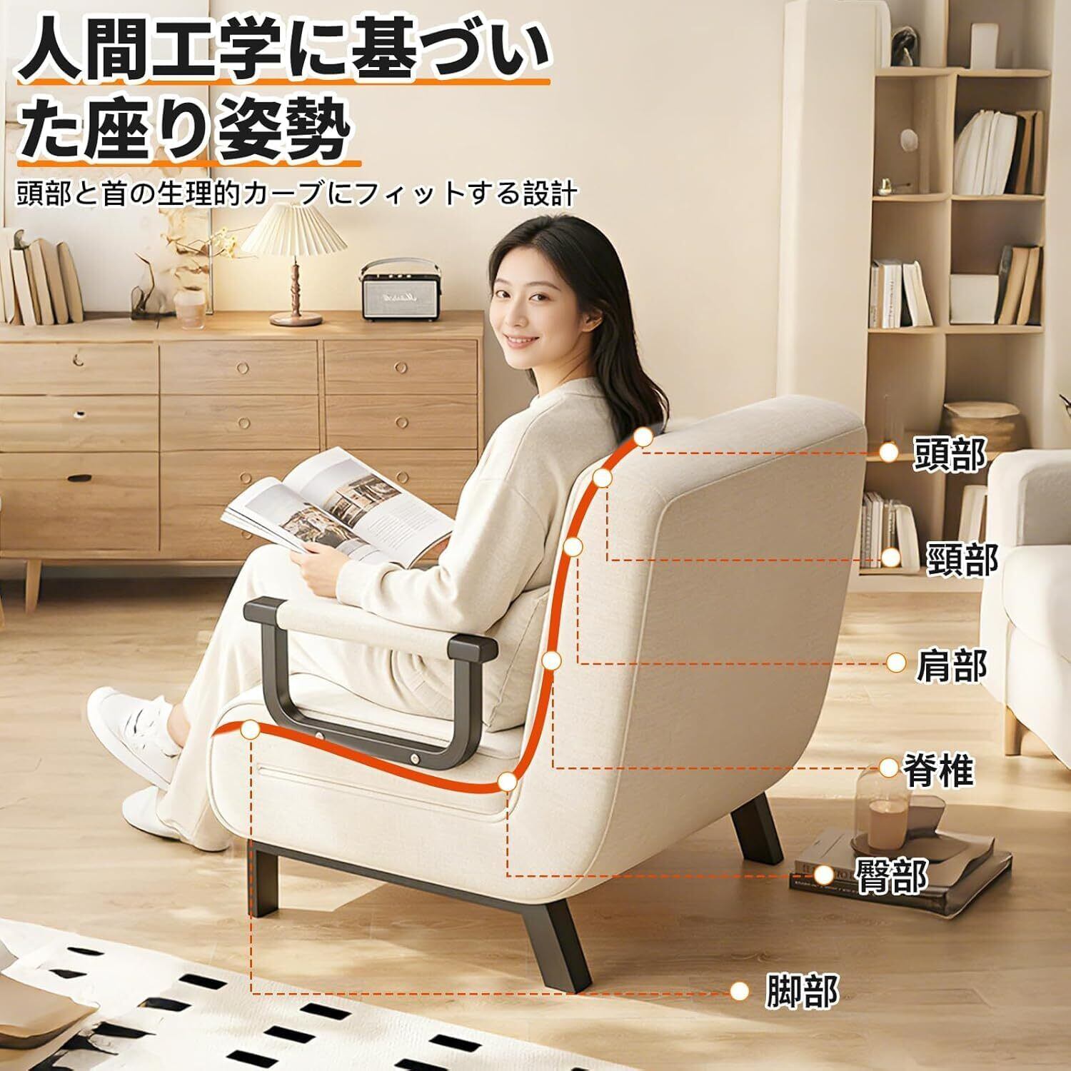 省スペース設計の折りたたみ機能で収納も簡単:使用しない時は簡単に折りたたんで収納可能。ワンルームや限られた居住空間にぴったりです。同色調のクッション付きで背中のフィット感を高め、枕代わりにもなる機能性も魅力。折りたたんだ状態でもスリムで、必要な時にすぐ展開できます。