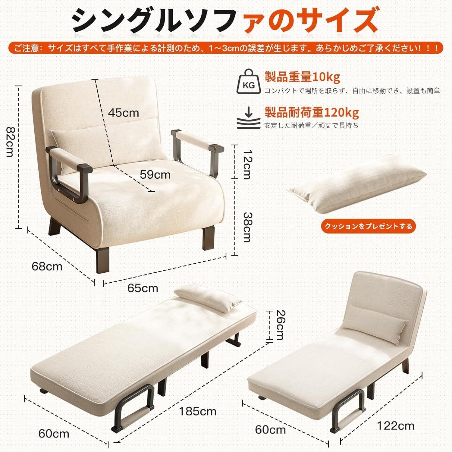 【2022最新】折りたたみソファベッド 一人用 高反発素材 5段階調整可能 3WAY クッション付き 肘掛付き ソファー椅 省スペース コンパクト インテリア用品 一人暮らし リビング 寝室 来客用 オフィスの昼休み 幅65cm ベージュ 組立簡単 説明書付き
