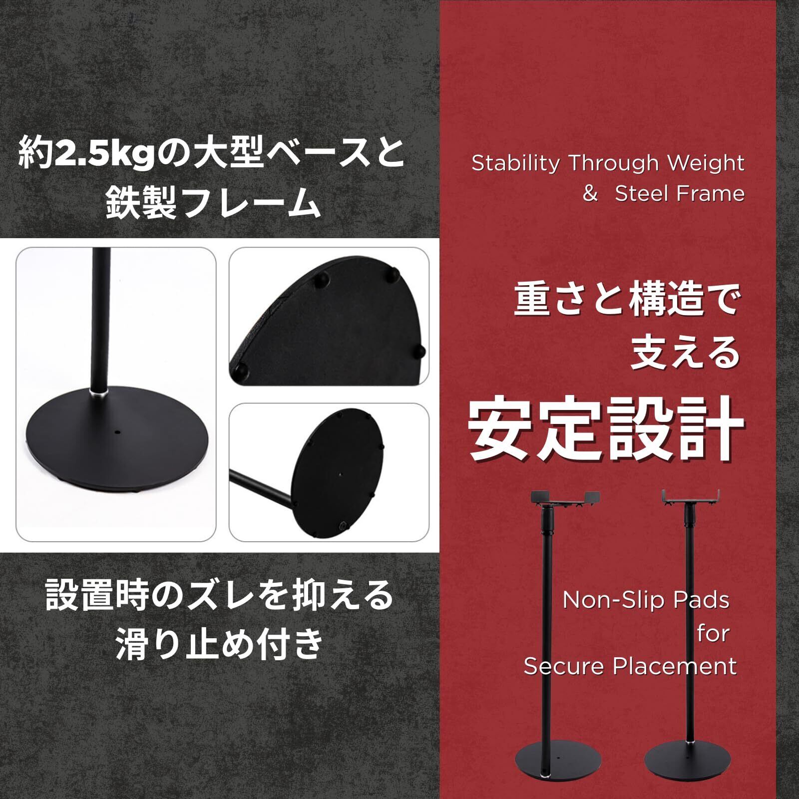 【重さと形状で支える安定設計】 直径25cmの大型丸型ベースは約2.5kgの重量があり、スピーカーをしっかり支えます。鉄製フレームと表面コーティングにより、見た目の美しさと実用性を両立。底面の滑り止めパッドが設置時のズレを抑えます。