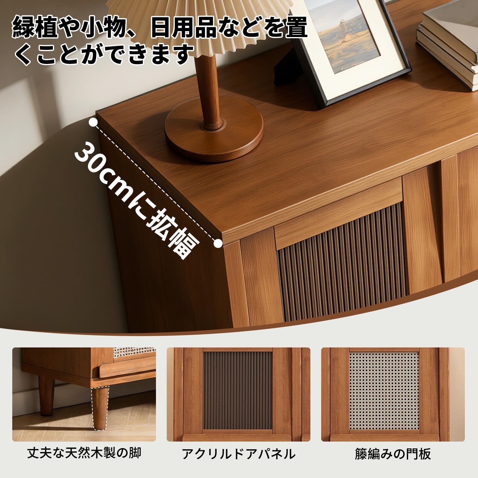 おしゃれな北欧ラタンデザイン:当キャビネットはラタン風テクスチャーと北欧木目調を融合したデザインで、シンプルながら温かみのある雰囲気を演出。ナチュラルな質感がリビングや玄関に自然に溶け込み、インテリアの統一感を高めます。洗練された見た目でありながら、実際のラタン製品よりお手入れが簡単で、おしゃれな空間づくりを手軽に実現できます。
