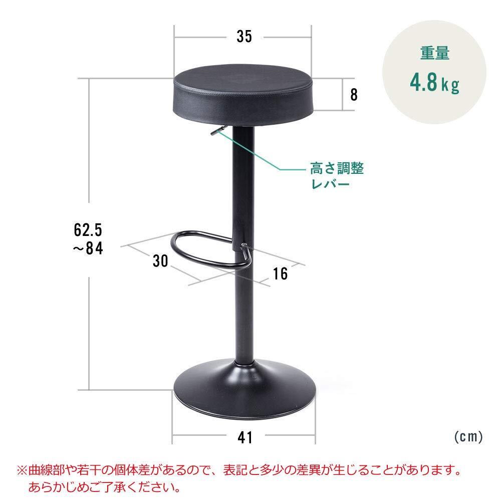 【仕様】 製品カラー:ブラック 座面サイズ:座面350mm 外寸サイズ:410×410×625~840mm 重量:4.8kg 張地:PUレザー 材質:座部/合板、脚部/スチール、クッション材/ウレタンフォーム