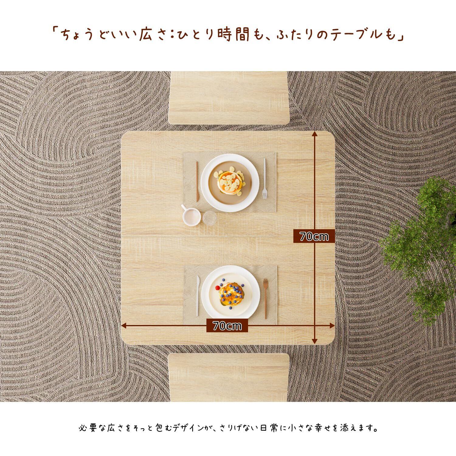 理想のぴったりサイズ:2人用テーブル:(約)幅70×奥行70×高さ75cm、チェア:(約)幅39.5×奥行42×高さ86cm、座面サイズ:(約)幅40×奥行40。一人暮らしやカップルの日常使いに最適な大きさで、小さな空間でも圧迫感なくフィットします。