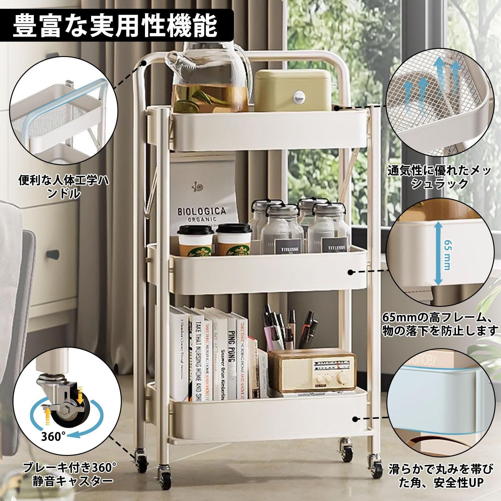 【使用便利】360°自由回転キャスターと人間工学に基づいたハンドル設計で、片手でも軽快に移動可能。キャスターにはブレーキが付いています、重い荷物を載せた状態でも安定固定が可能で、キッチンでの調理中や浴室での使用時に不意の移動を完全防止。メッシュ格子デザインを採用し、効果的に空気を循環させ、ホコリの発生を防ぎ、通気性を確保します、お手入れも簡単です。