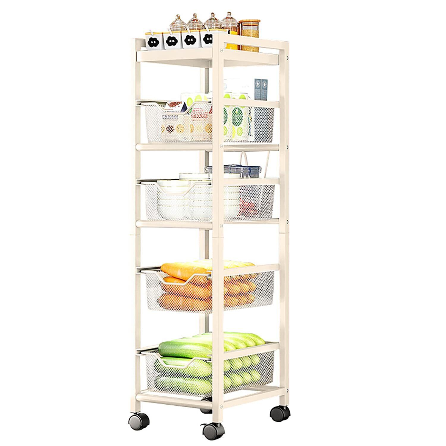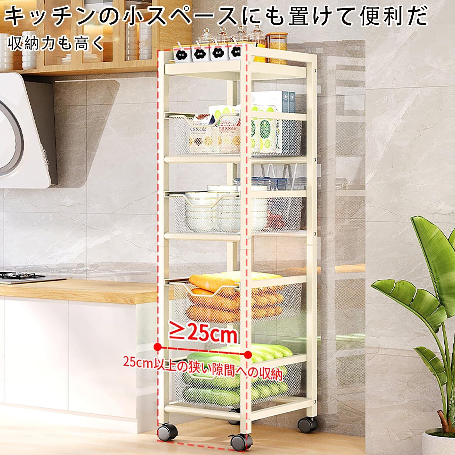 隙間の活用にピッタリ: キッチン収納ラックは全体の幅はわずか25cmで、25cm以上の狭い隙間への収納に最適。引き出し式のスライド式収納バスケットを採用しており、狭いスペースでもスムーズにアイテムの出し入れが可能です。5段階の設計で、高さは103cm、各段約30cmの高さがあり、さまざまな高さのアイテムの収納ニーズに対応します。