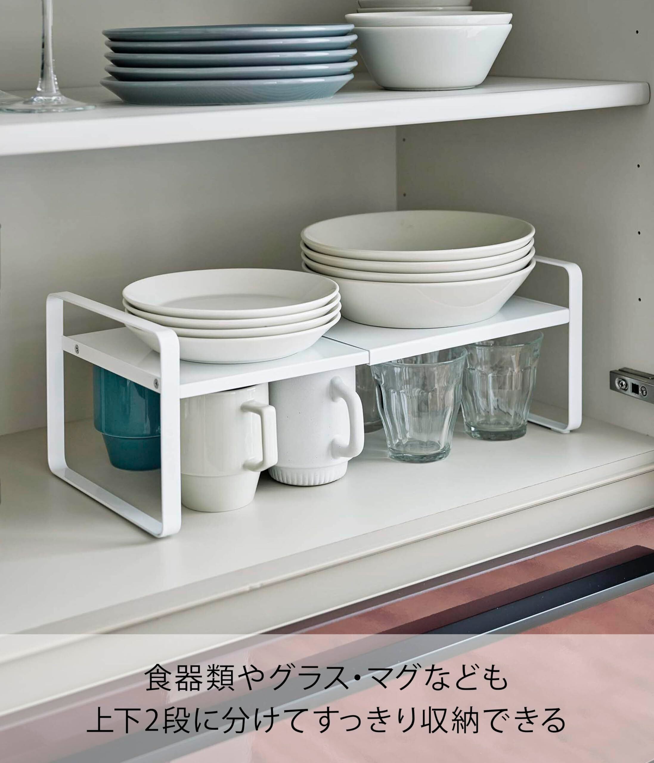 伸縮可能だから食器棚やパントリーの中のスペースを有効活用! 上棚にはマグボトル下にはキッチン小物などを収納すると便利。