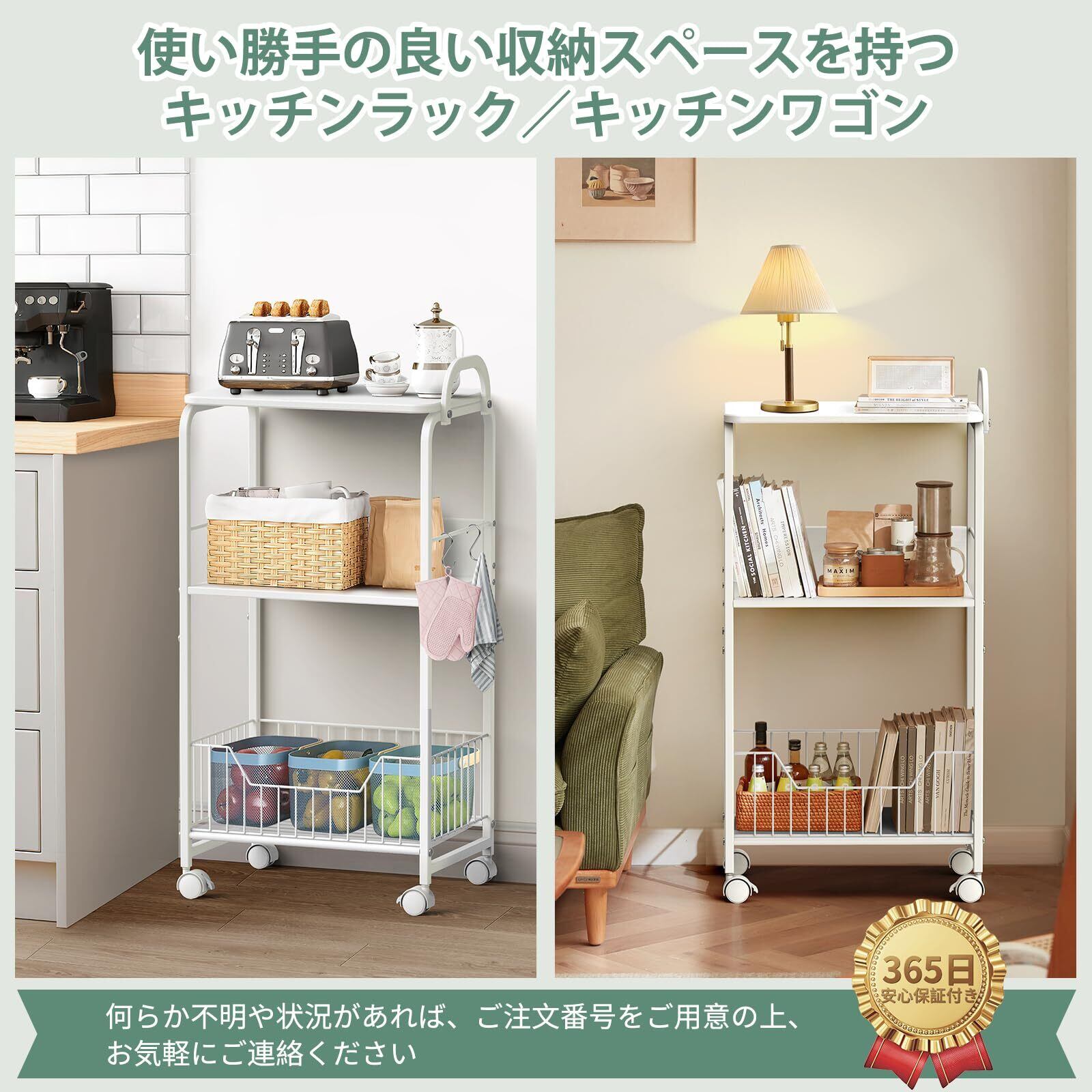 【製品仕様&使い勝手の良い収納スペース】製品サイズ:奥行30×幅43×高さ87.3cm 本体重量:約5kg;優れた収納空間を持つ棚板・天板と収納物の出し入れもしやすい凹字底部収納バスケットが付いておる3段キッチンラックです。使い勝手の良い収納スペースを持ち、食器・小型家電・日用品・雑貨など全てまとめて収納できており、部屋の整理整頓に活用できます。また、本製品は購入日から1年間の期間を提供して、もし何らか不明や状況があれば、ご注文番号をご記入して、お気軽にご連絡ください。