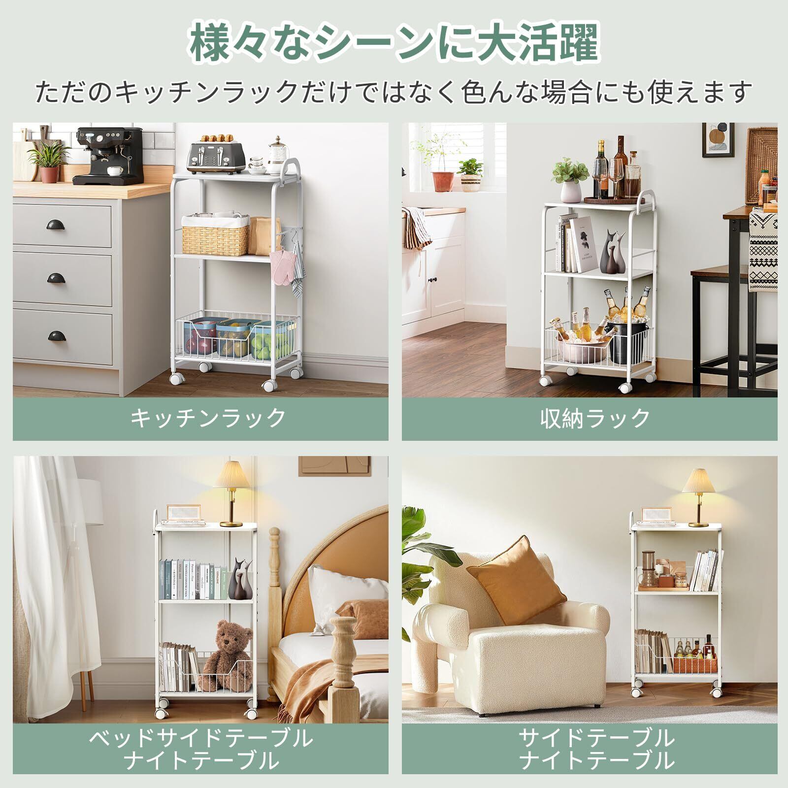 【多様な活用場所】シンプル且つ落ち着いたデザインで、インテリアに馴染みやすくて、キッチン・リビング・書斎・物置など場所を問わず大活躍しております。ただのキッチンラックやキッチンワゴンだけではなく、サイドテーブル、ベッドサイドテーブル、 ソファーテーブルやナイトテーブルとしてもおすすめです。