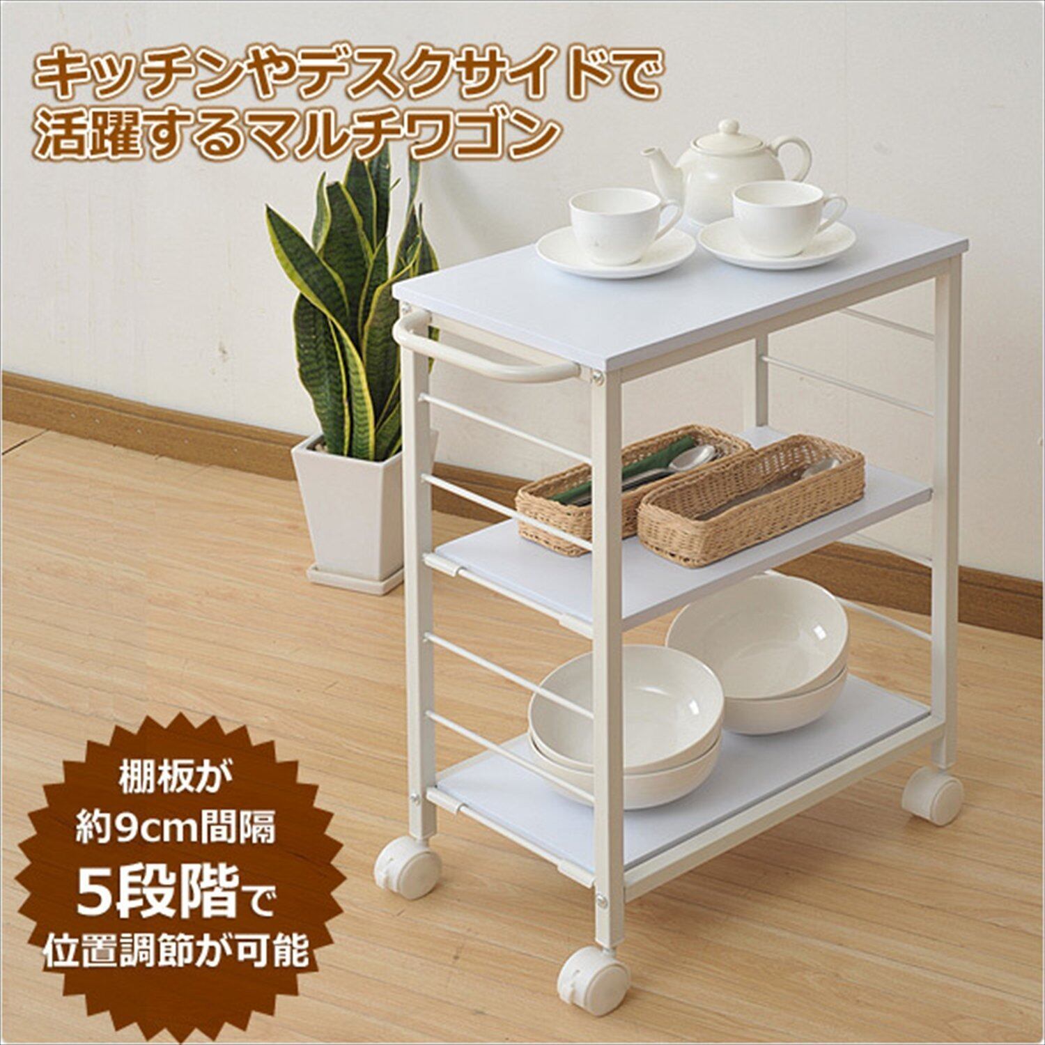 キッチンサイドやデスクサイドなどで大活躍間違いなしのワゴン。棚板は9cm間隔5段階で調節ができるので、モノに合わせて高さを変えられます。キャスター付だから移動もやすいなので、お部屋の移動にも便利です。