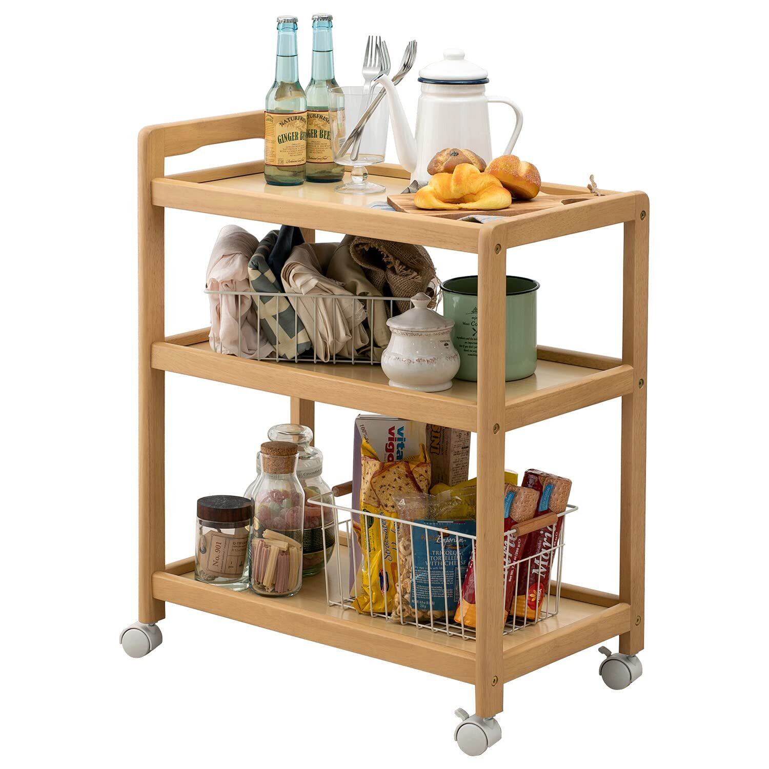 【取っ手付きで移動がしやすい】:取っ手付きで移動がしやすい木製キッチンワゴン。鍋や食器類、調味料、食材を多く収納しても移動がラク!高さがあるものも一つのワゴンに収納すれば見た目もすっきり。3段棚は各棚約5kgまで物を載せられ、スリムな見た目ながら大容量。