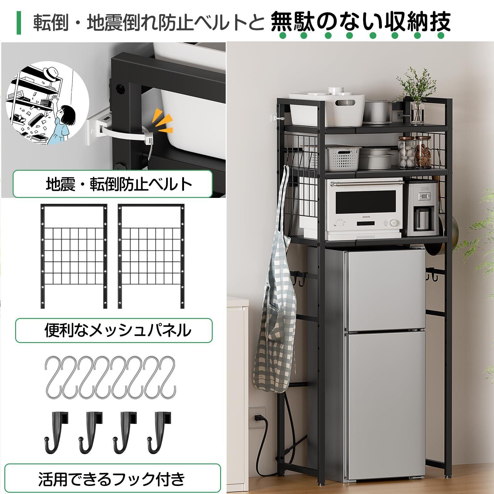 【大型レンジも置ける奥行き42cm】各棚番の奥行きが42cmがありますので、大型電子レンジ以外、トースター等の家電、フライパンや収納用バスケットなど大きな物も収納できます。1段あたり大小2枚の棚板で構成されており、取り外しも簡単デッドスペースになりがちなゴミ箱、小型冷蔵庫、乾燥機、洗濯機などの上収納をプラスします。背面に板がないため配線がしやすく、デザインはシンプルで、耐荷重も十分です。