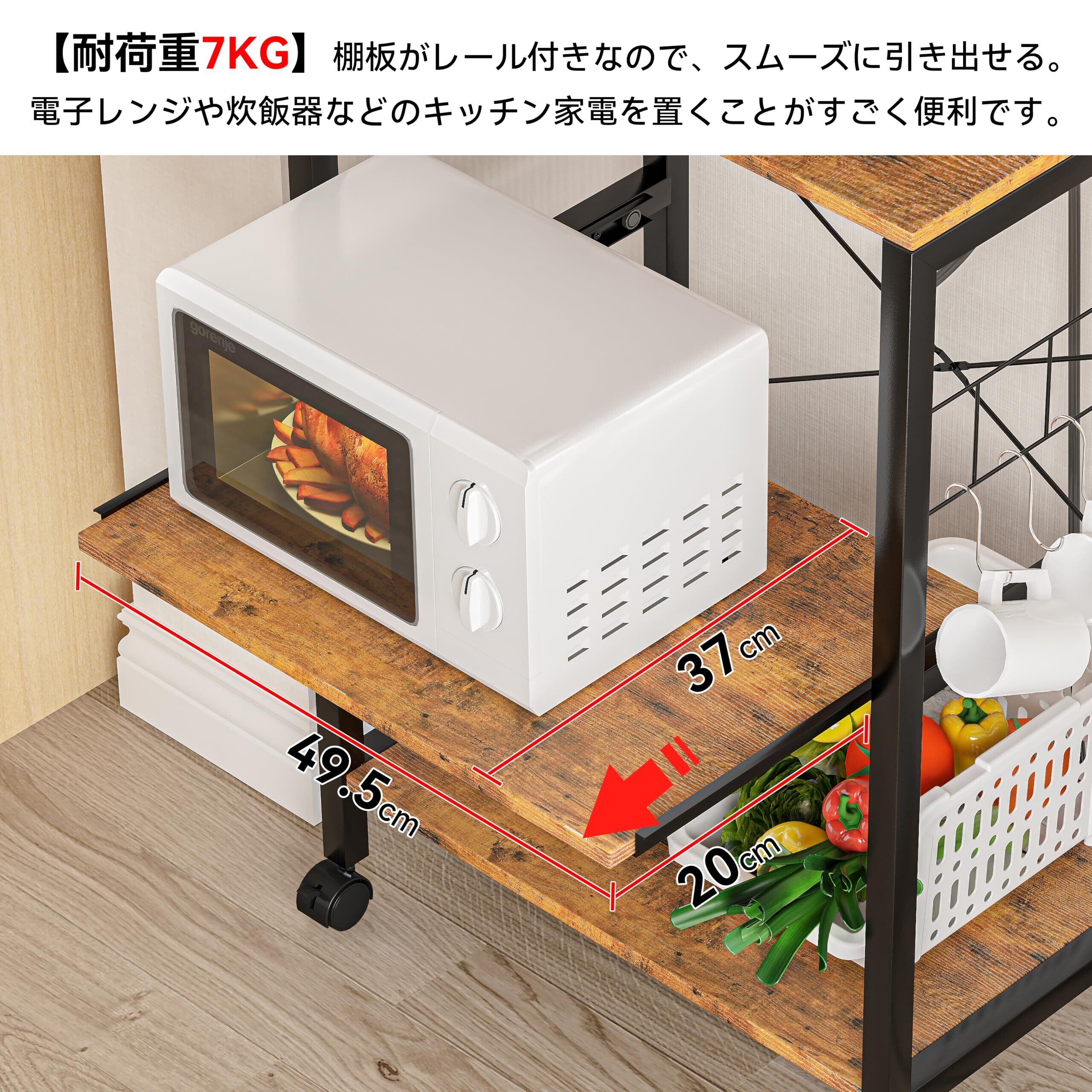 LunarLight キッチンベイカーラック 幅57×奥行39.2×高さ133cm キッチンラック レンジラック オープンラック プリンター台 2口コンセント付き 棚板レールでスライド式 総耐荷重100kg レンジ炊飯器など対応 S字フック ストッパーキャスター アジャスト付き 耐震転倒防止 強度安定 錆び防止 耐摩耗性 防水性 耐熱性機能 (ヴィンテージRB, スモールS)