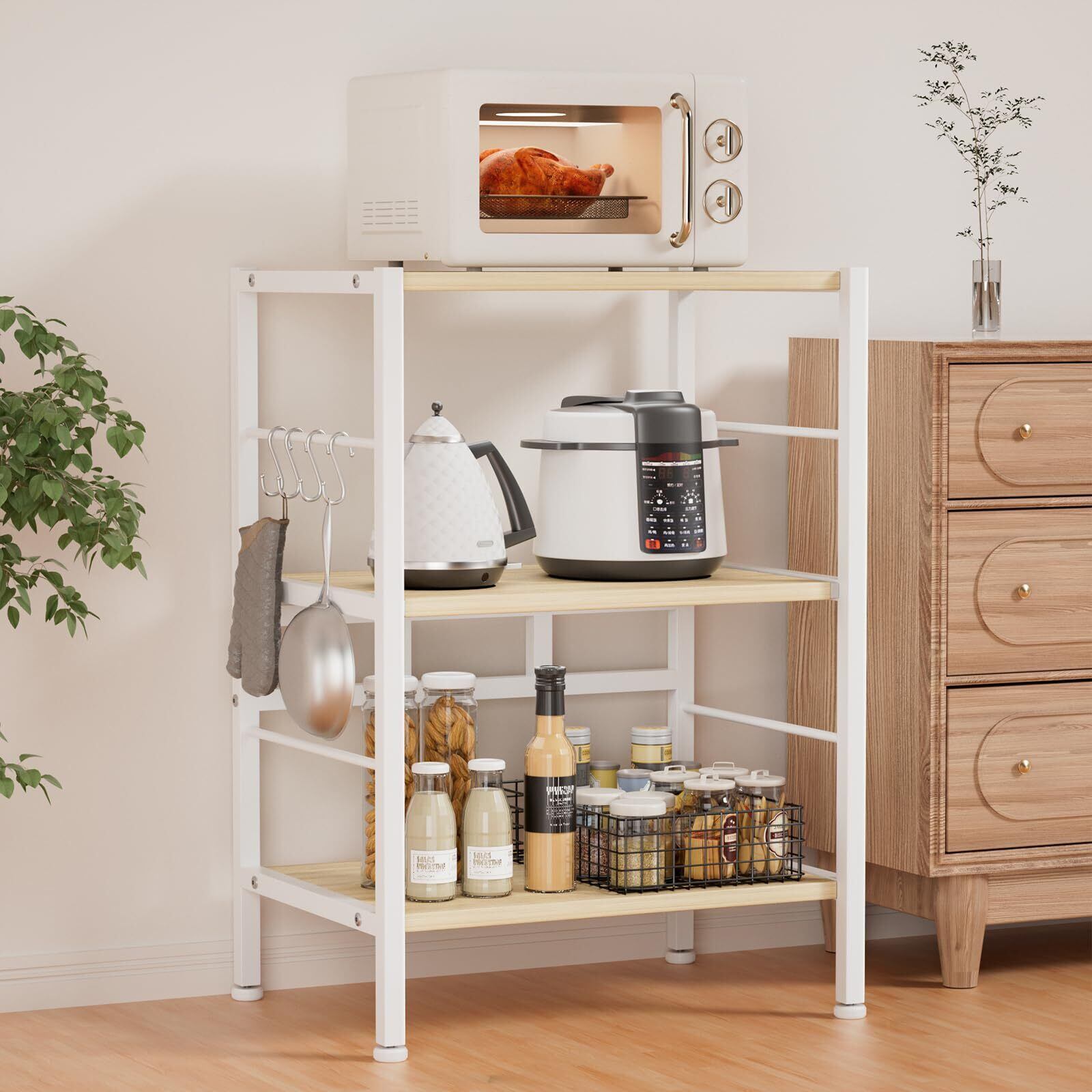 【多機能収納ラック&充実の収納力】このキッチンラックは3段構造を採用しており、電子レンジ、調味料、食器類などをすっきりと整理して収納できます。耐荷重約30kgの棚板で大型レンジまでも安全に置けます。さらに、タオル掛けや4つのS字フックも付属しており、調理器具や小物を整理して収納でき、キッチンスペースを最大限に活用できます。中段の棚板はスライド式になっており、炊飯器や電気ケトルなど蒸気を発する家電を置く際に引き出すことで、蒸気が上段の棚板に当たらず、棚板のカビや劣化を防ぐことができ、使用寿命を延ばします。
