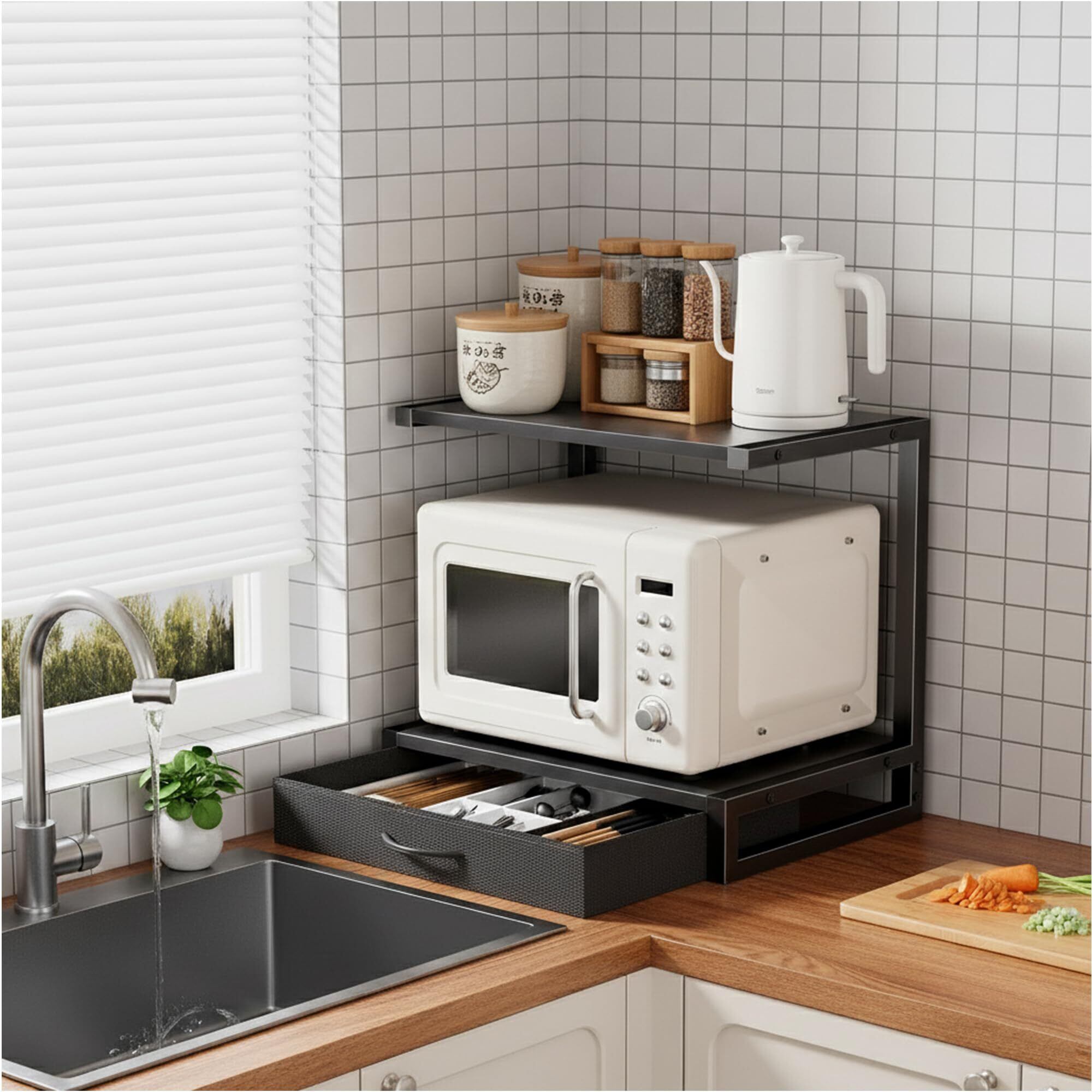 【在庫セール】レンジラック 卓上 引き出し付き 電子レンジラック 冷蔵庫上収納 キッチンラック 幅44cm×奥行30cm×高さ40cm 省スペース 耐荷重40kg イロドリモク (ブラック)