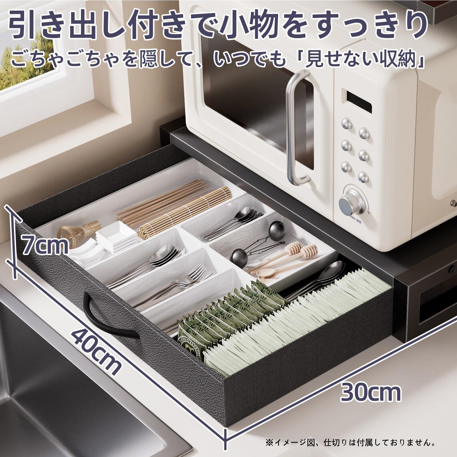 【考え抜かれた3段設計!キッチン用品をまとめて収納】この電子レンジラックは、多様な収納ニーズに応える革新的な三層設計です。上段には調味料、食器、コーヒーメーカーなどをすっきりと配置でき、中段には電子レンジやトースターを安定して設置できます。下段には便利なスライド式引き出しが付いており、ラップやカトラリー、布巾など生活感が出やすい小物や湿気を避けたいアイテムもスマートに収納可能。散らかりがちなキッチン用具や小物を整理整頓し、美しく使いやすいキッチン空間を実現します。