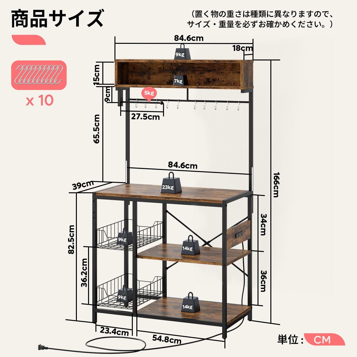 【商品仕様・一年付き!】◆レンジラックの本体サイズ:幅84.6×奥行41×高さ165.5cm、梱包サイズ:15.5×46×95cm。◆材質:パーティクルボード(メラミン加工)、スチール(ラッカー塗装)◆本体重量:約18.55kg、梱包重量:20.35kg(※組み立て工具同梱)。◆長くお使い頂ける高い耐荷重設計:上段棚2枚全体16kg、中部大天板23kg、バスケット2杯各9kg、固定棚2段各14kg。※お客様組立て品です。