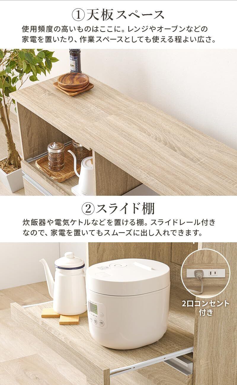 萩原 伸縮式 レンジボード 食器棚 キッチンラック 【 幅が調節できる 】レンジ台 作業台 大容量 2口コンセント 扉 付き 幅 75 ~ 125 奥行 40 高さ 84 cm ナチュラル VKC-7141NA-OS