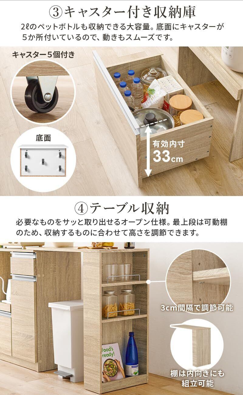 すっきりとしたデザインでどんなお部屋にも馴染みやすいキッチンカウンター。キッチンカウンターに拡張テーブルがついたお得なセット。2ℓペットボトルも収納できる、キャスター付き収納庫タイプ。