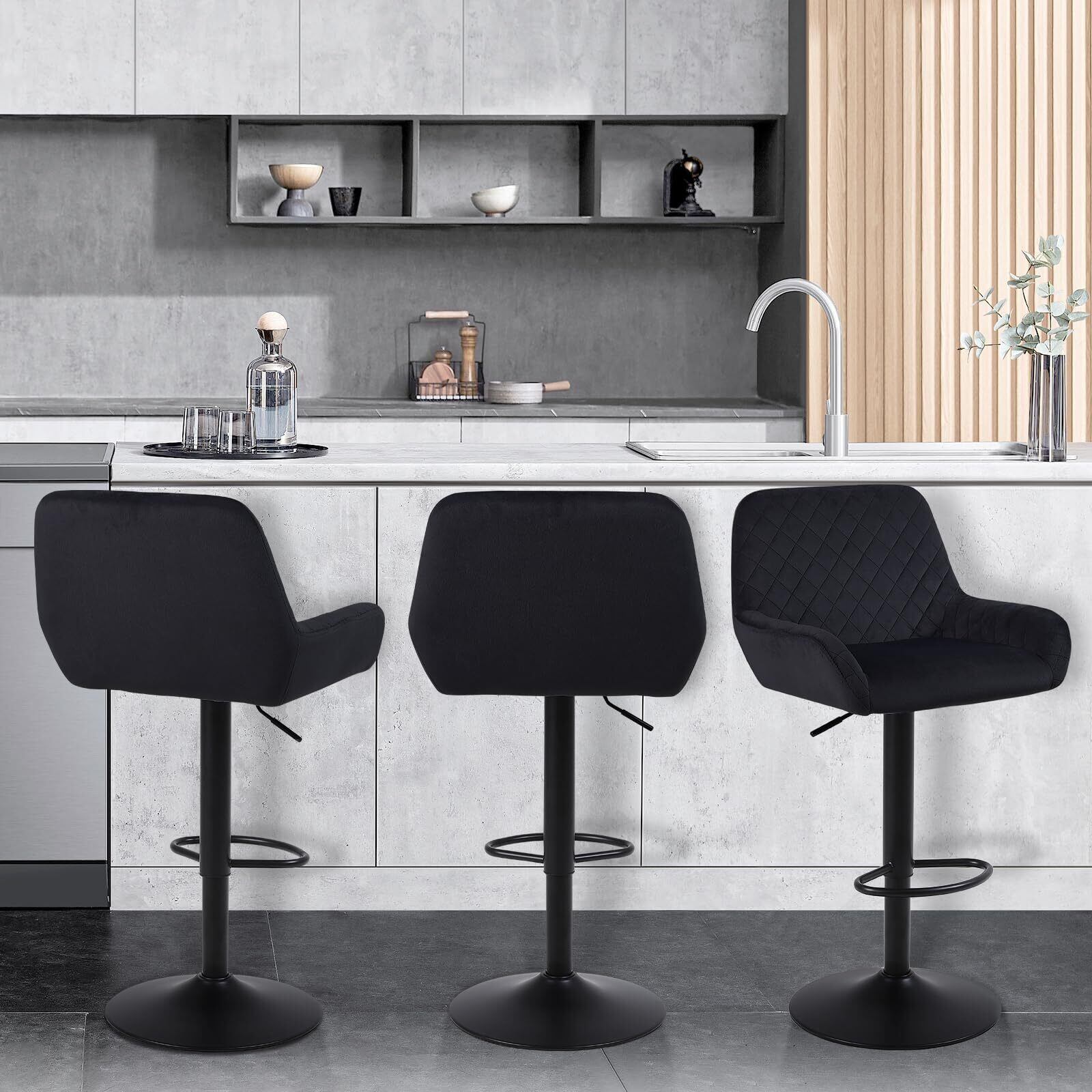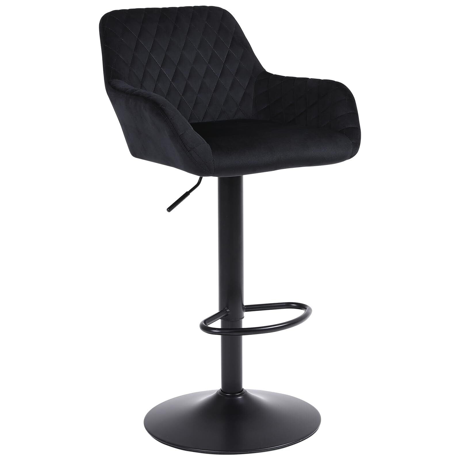 Youhauchair カウンターチェア ベルベット生地 高さ調節可能 回転式バーチェア 背もたれ 肘掛け付き 足置き バースツール バー、カウンター、キッチン用 1脚-ブラック