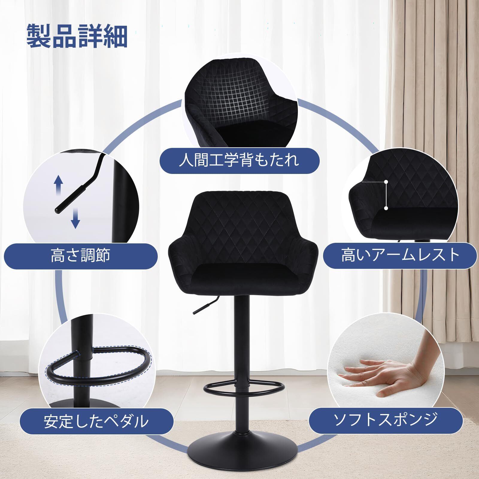 比類なき快適さ:当社の通気性に優れたベルベット生地は、極上の柔らかさと独特の光沢を有します。内蔵されたシワ防止加工と優れた耐久性を備え、バースツールの座面は高密度フォームで構成され、心地よい座感を提供します。中央部の背もたれは腰をしっかり支えます。