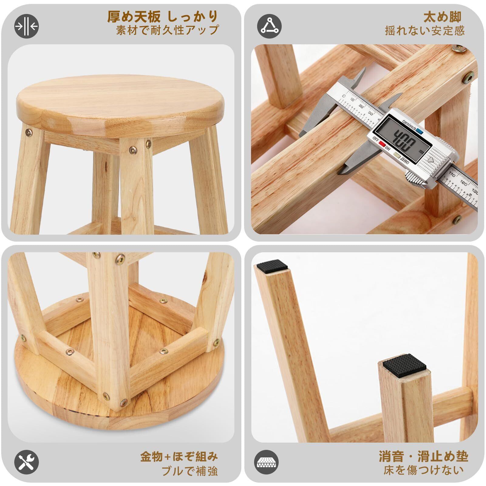 【耐荷重150kg & 耐久性】高密度の木材と脚部の頑丈な接合により、150kgという高い耐荷重を実現。長い時間ご使用いただいても、ガタつきやゆがみが発生しにくい、安心の構造です。ご家族はもちろん、カフェや居酒屋などの商業施設でも、高い信頼性を発揮する木製スツールです。