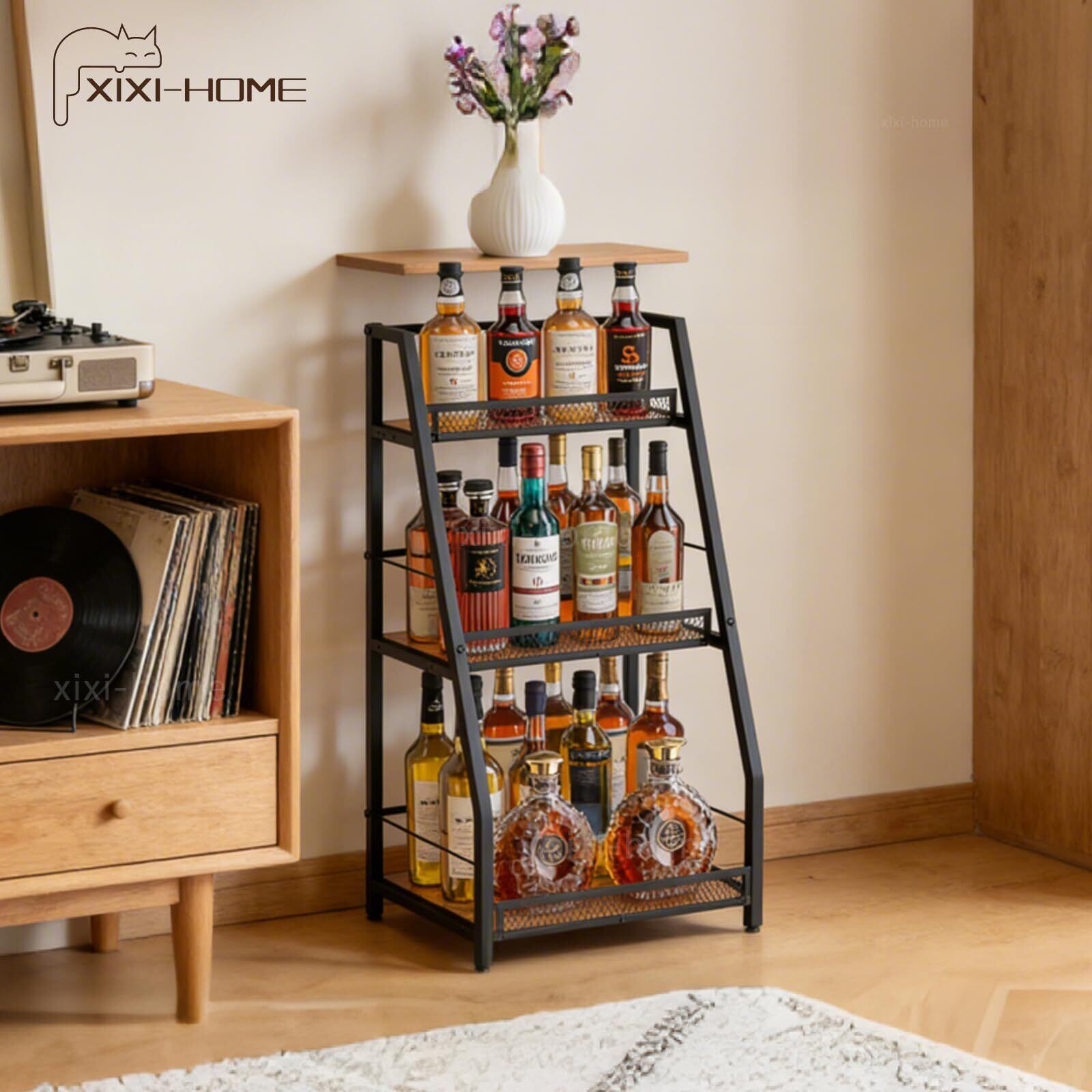 ワインバーキャビネット 木製 3段 酒棚 ディスプレイ ワインラック ワインホルダー お酒収納ラック 収納 ウイスキー ガラスホルダー付き フェンス付き おしゃれ 大容量 ウイスキー棚 ラック 棚 テーブル 収納ラック