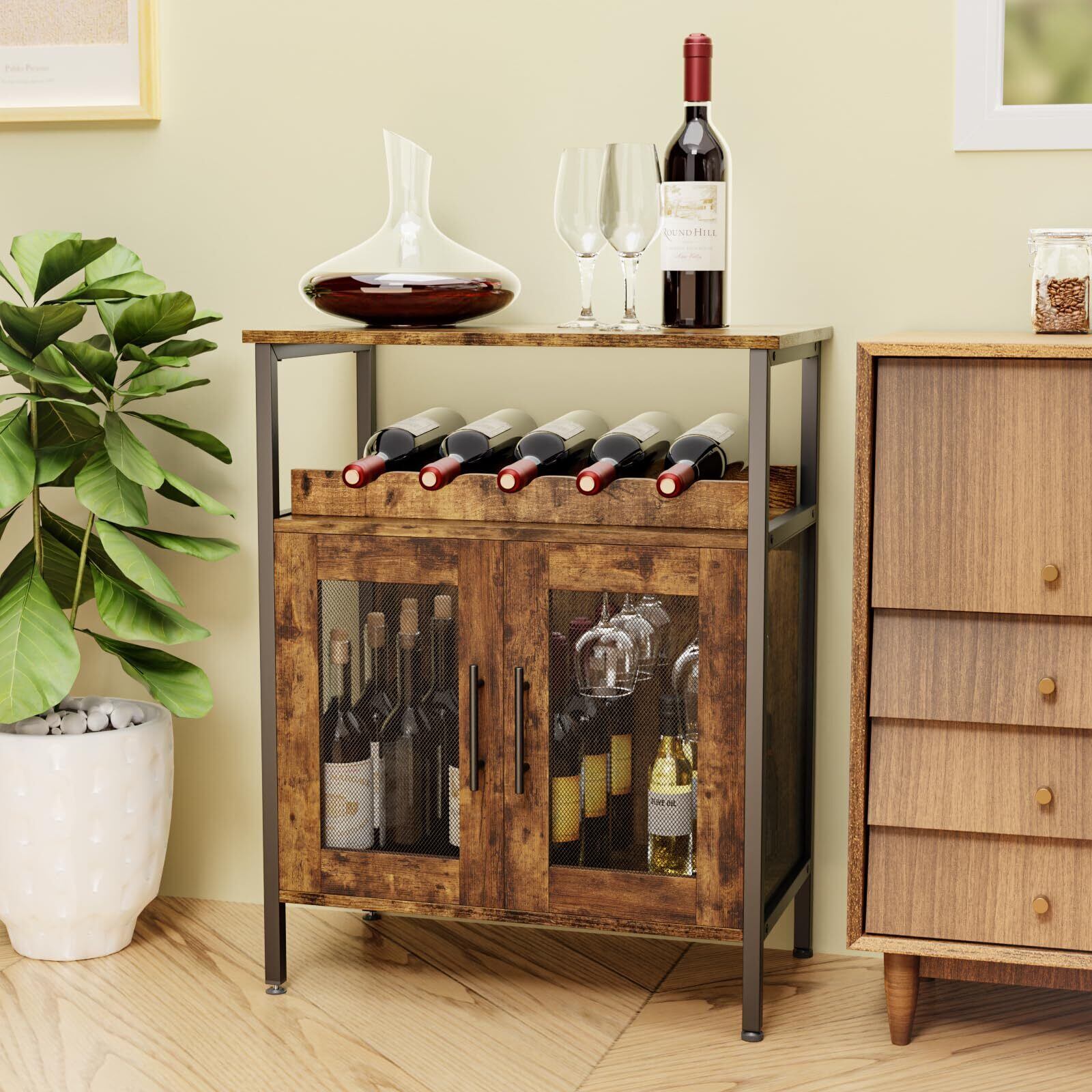 ウイスキー棚 酒棚 お酒収納ラック ワインキャビネット 自立式 大容量 5本ワイン収納 8グラスホルダー付き スチール製 レトロ調 防塵メッシュドア 省スペース 組み立て簡単 バーキャビネット ウイスキーラック ディスプレイ おしゃれ 60*34*79cm ブラウン