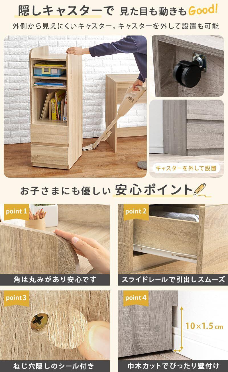 隠しキャスター付きで模様替えなどの移動やお掃除もらくらく!スリムタイプ同士や、ワイドタイプとも連結できるため、兄弟、姉妹で並べてのご使用もオススメです。
