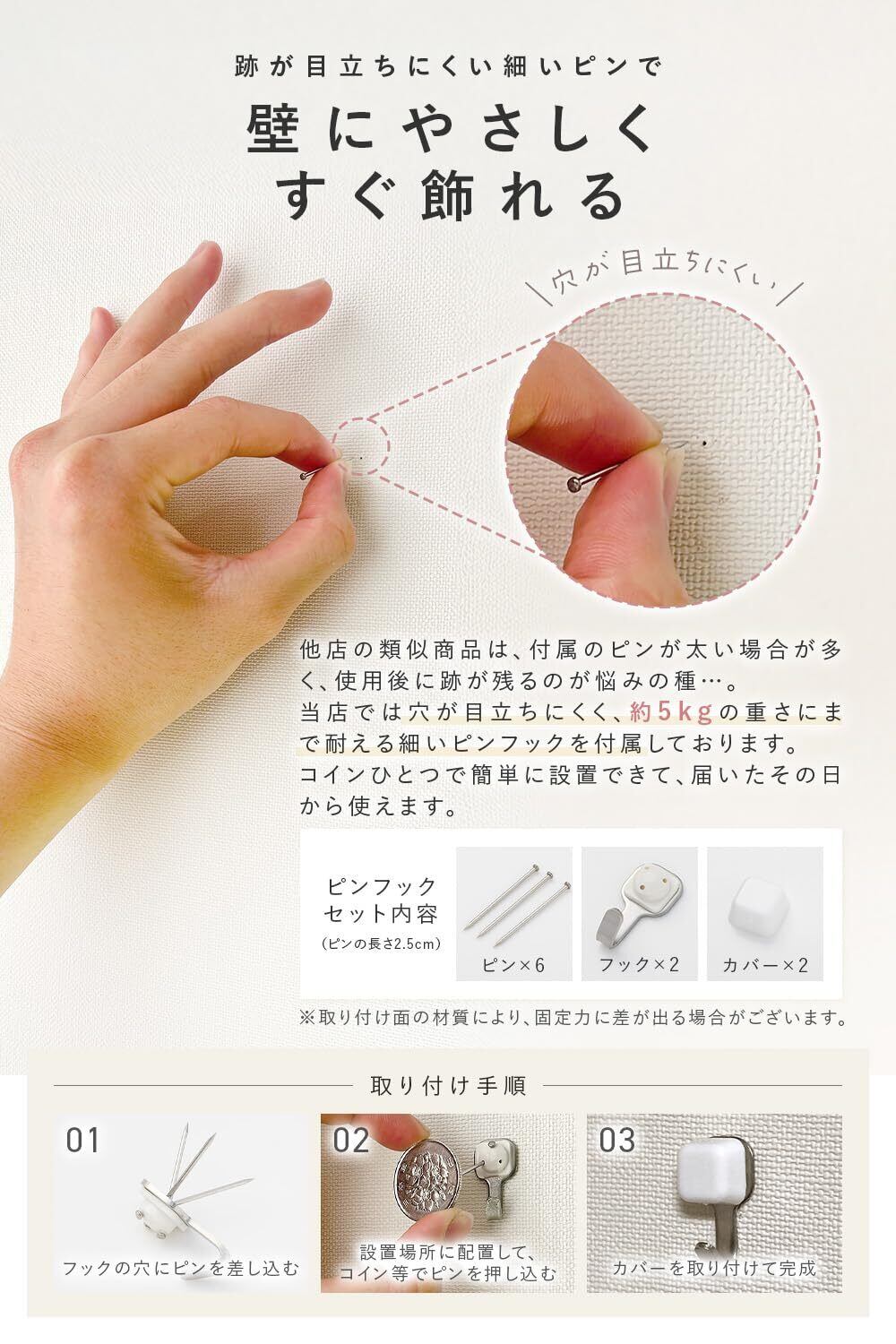 【注意事項】取り付け場所の材質によって、フックの固定強度が多少異なります。新建材(板壁など)の場合はハンマーのご使用をおすすめします。また、貴重品や壊れやすいものは掛けないでください。針の先端が鋭利になっていますので、取り扱い時のケガには十分ご注意ください。