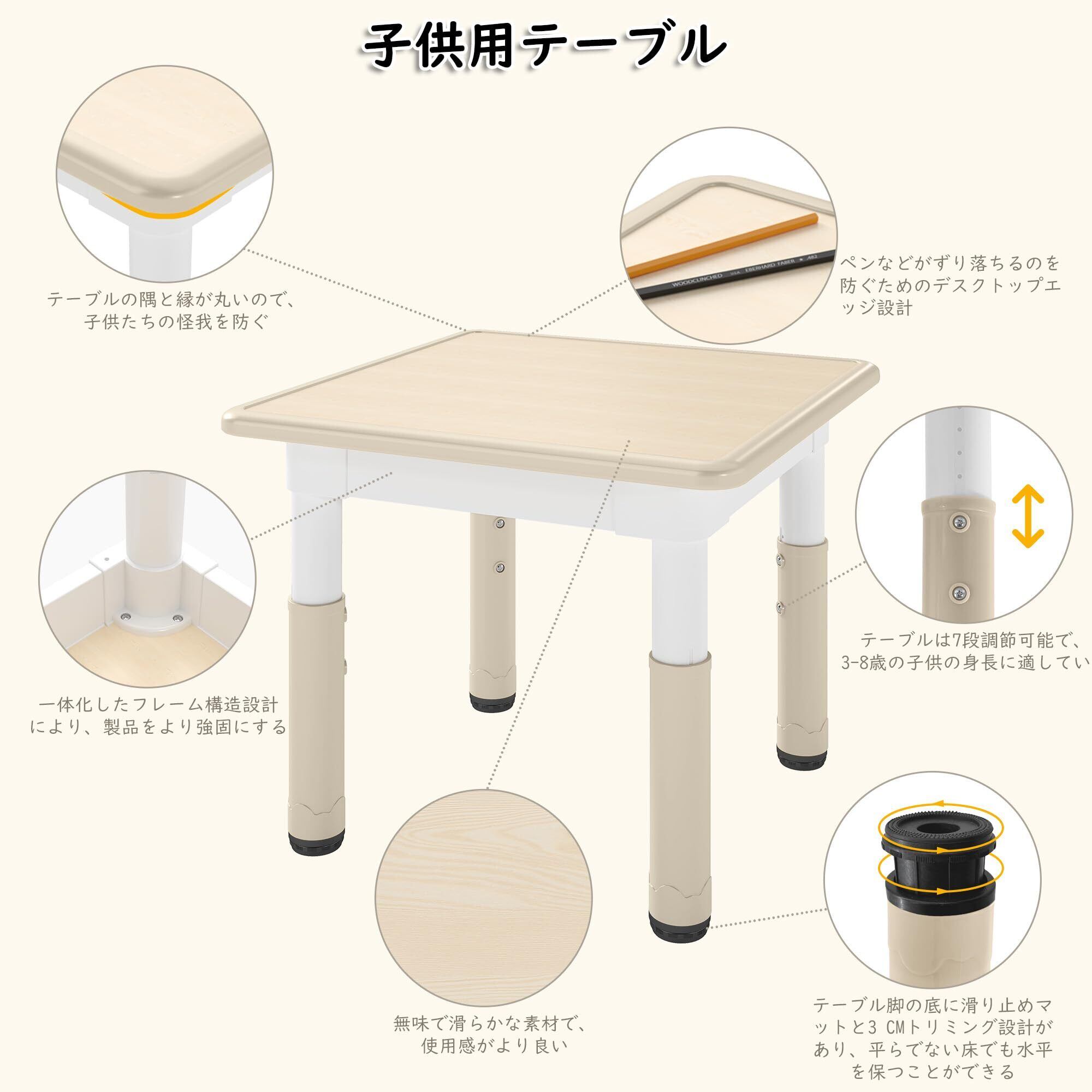 子供たちのための特別なデザイン:GITAWUSAの子供用テーブルと椅子のセットには、子供が使用中にぶつかって怪我をしないように丸みのある縁がデザインされています。また、椅子は人間工学に合った構造を採用しており、子供たちが椅子に座っている間に、椅子は臀部の曲線にフィットし、背もたれが子供たちの脊椎を支え、子供たちを快適にすることができます。