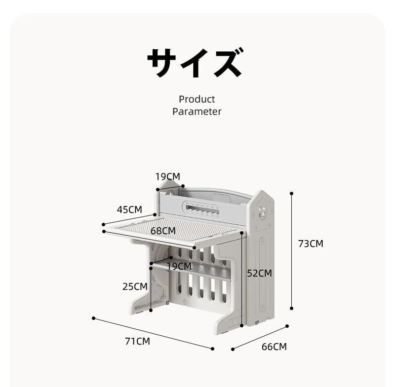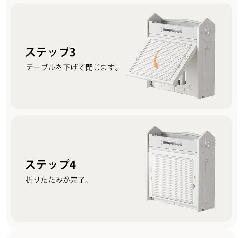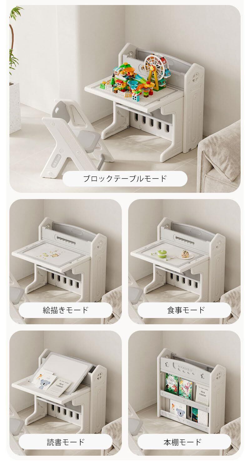 デスク×1、チェア×1の便利な2点セットです。スペースを有効活用できるたためるタイプ。コンパクトに折りたたみ、収納場所を選びません。 【ブロックテーブル】プロック遊ひで子どもの能力育成をサポート!想像を膨らませてゼ口から好きなものを作れます。 安心安全なHDPE素材、無毒無味そしてノンホルムアルデヒド、1歳頃からお絵かき、おままごと、ぬりえ、粘土遊びなど幼児学習に最適 ワイドなホワイトボードデザインで自由に絵を描くことができる。本棚が付いているので、お子様の読書習慣を自然に育みます。 機能面・デザイン面だけでなく安全性にもこだわっています。 保育園や幼稚園など入園・入学のプレゼントとしても人気 【両面活用デスクトップ】ホワイトボードめくるだけで新たな使い方になる。 *ご注意:天板は水洗いできません。汚れなどがある場合布で拭いてください。 キッズデスク&チェア 対象年齢:1-10歳 海外SNSに話題のキッズデスク&チェアセット 多機能キッズデスクセット読書モード+ブロックテーブルモード+食事モード+絵描きモード 【detail】【角丸設計】丸みを帯びたデザインで不意による怪我を防止【組立カンタン】回すだけでカンタンに組立出来ます。【安定感抜群】広がり式脚部設計により安定感抜群!【滑り止め付き】床面を傷から守ります。【落下防止】ガードはめもり付きで知育玩具にもなれます。