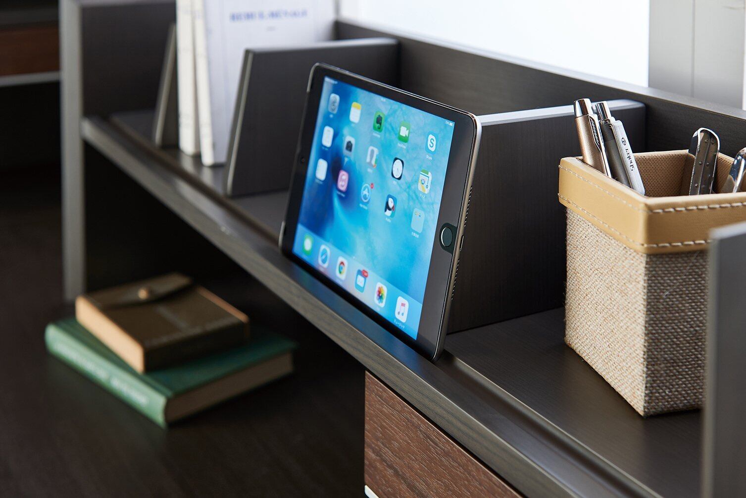 タブレッド用溝があるため可動仕切板の前側の面で支えることで立てかけた状態で設置できます。