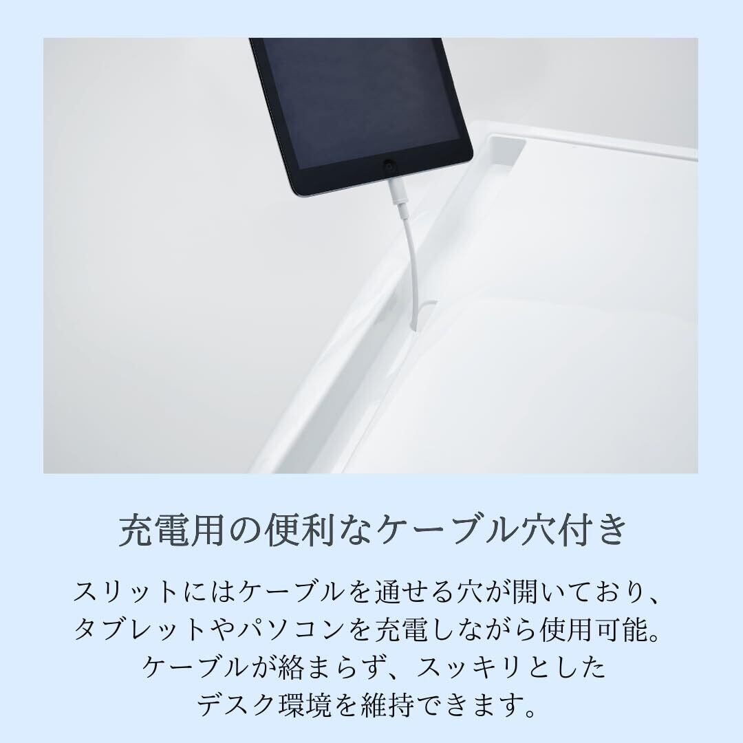 【充電に便利なケーブル穴付き】溝にはケーブル穴が設けられており、タブレットやスマホを立てたまま充電が可能。学習中や動画視聴中でも充電切れを気にせず使用できます。