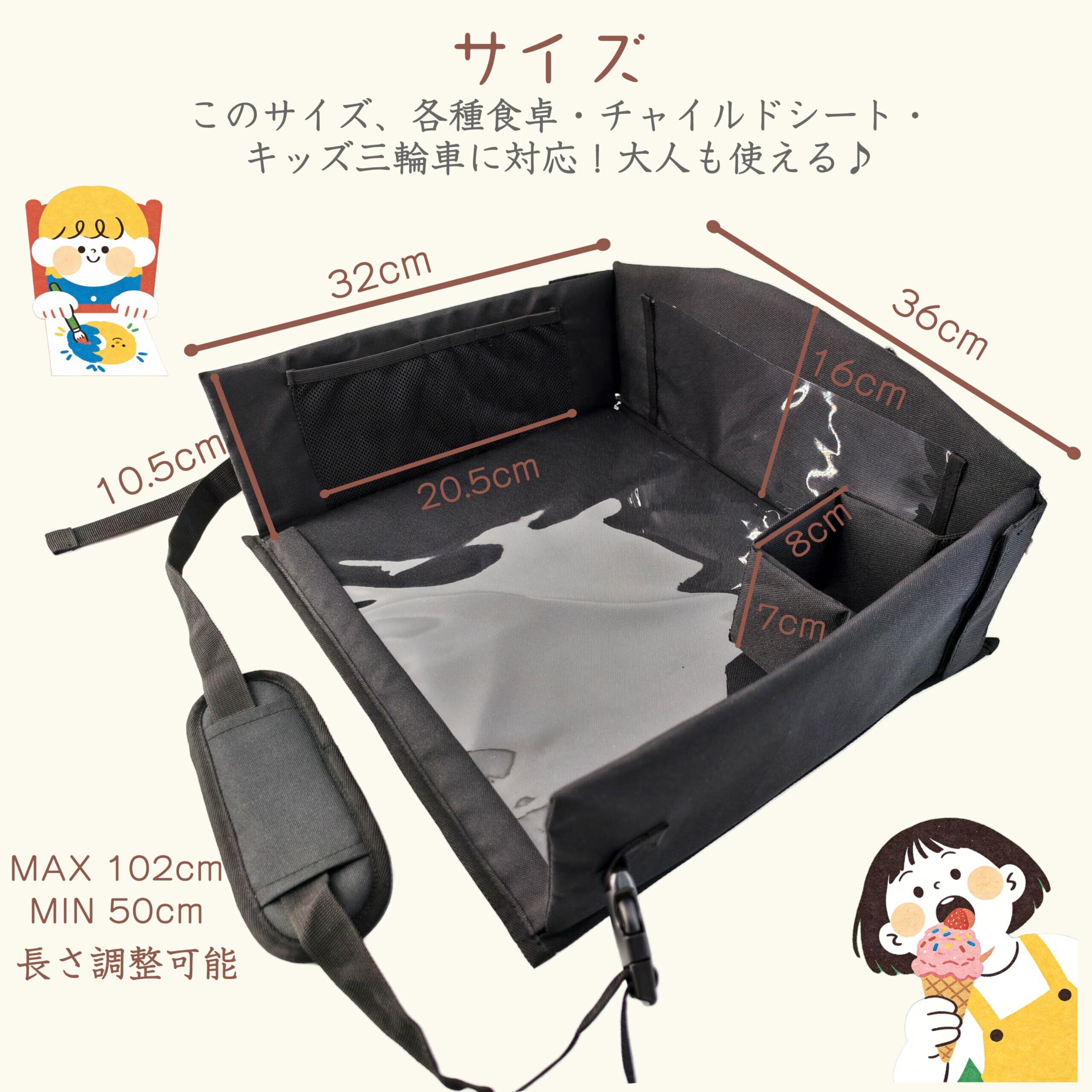 【チャイルドトレイテーブル商品情報】子供テーブル展開後のサイズ:36 x 32 x 16 cm。素材:PVC、オックスフォード布。チャイルドトレイベルトが調整できますので、子供の身長に合わせて使えます。 子供テーブルの表面が 透明PVCプラスチックで マーカーペンで絵描き、濡れた雑巾で 簡単に消すことができます 食事の油とか 簡単に拭いて汚れ無くなります、防水防油です