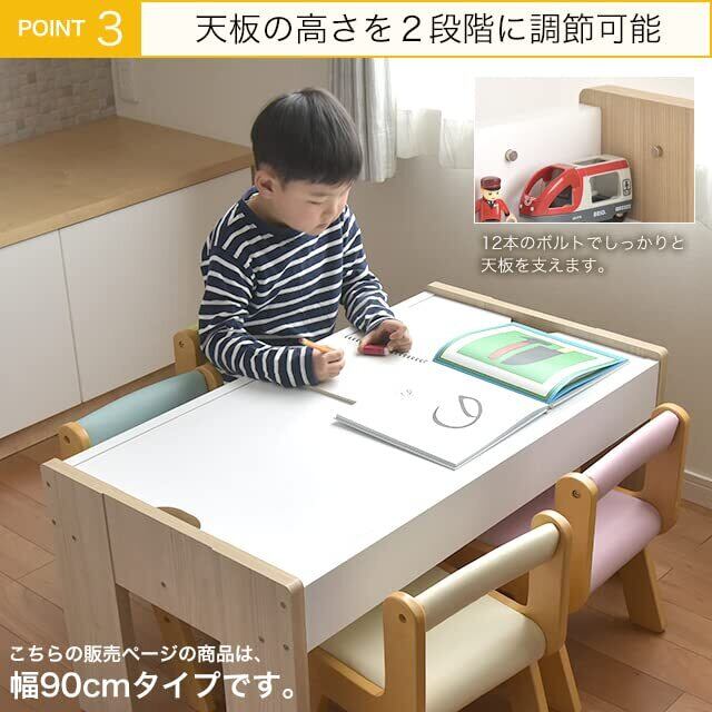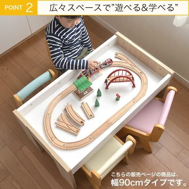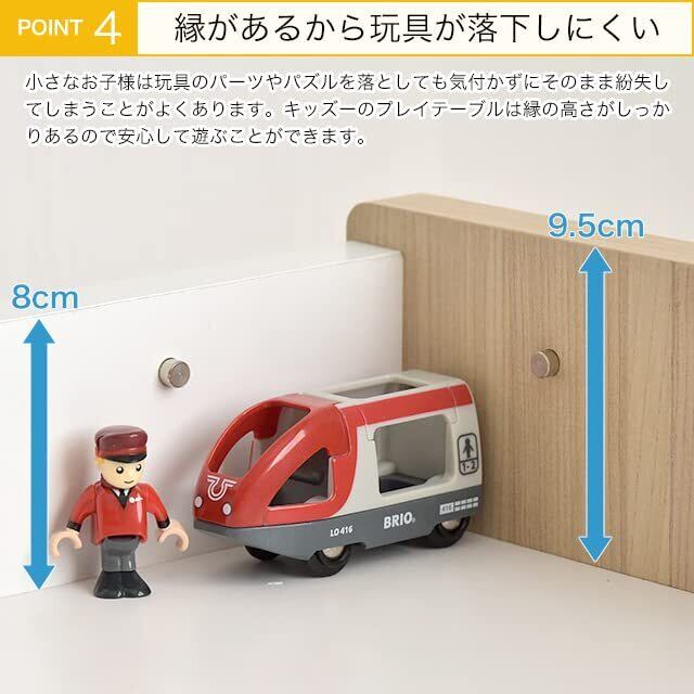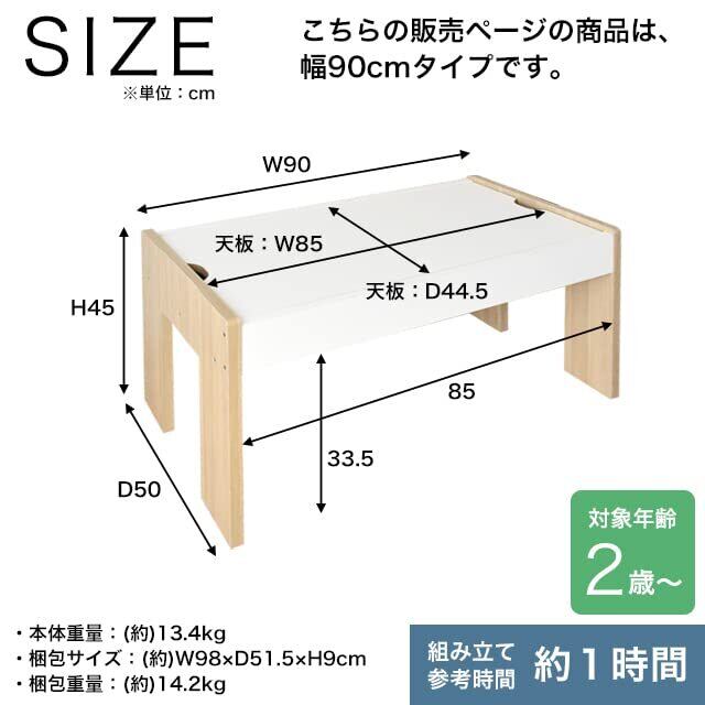 キッズーシリーズのプレイテーブル幅90cmタイプです。 レール遊び、ブロック遊び、お絵描きやお勉強におすすめです。 お手持ちのトミカやプラレール、ブリオ、レゴ、シルバニアファミリーやこえだちゃんと木のおうち、りかちゃんハウス、ここたまハウスなどのドールハウス、おままごとや積み木などにもお使いいただけるプレイテーブルです。 また天板はリバーシブルになっています。(表面:ナチュラル色、裏面:グレー色) 対象年齢:2~5歳。 組み立て時間:(約)1時間。