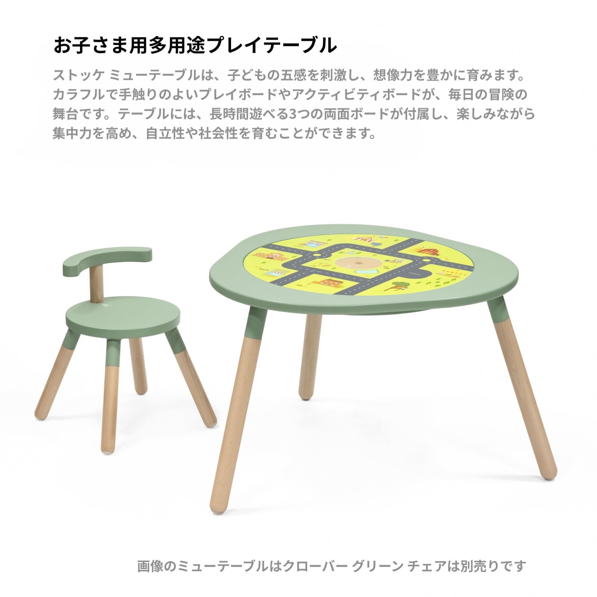 遊んで学んで成長するキッズテーブル! 子どもにとって、遊びは楽しいものであり、絶好の学びの機会でもあります。ストッケ ミューテーブルは、子どもの五感を刺激し、想像力を豊かに育みます。カラフルで手触りのよいプレイボードやアクティビティボードが、毎日の冒険の舞台です。ブロックやお絵かき、恐竜ごっこであっても、子どもたち自身が手と頭を使って未知の世界を探求することを「面白い!」と思う瞬間が遊びの中にはあふれています。ストッケ ミューテーブル プレイテーブルは、耐久性が高く丈夫な木材を使用し、柔らかな丸みを帯びた曲線が特徴です。小さなお子さまから、就学後のお子さままで、それぞれの発達段階に合わせた遊びを楽しむことができます。テーブルには、長時間遊べる3つの両面ボードが付属し、楽しみながら集中力を高め、自立性や社会性を育むことができます。高品質の天然木材を使用したプレイテーブルの脚部にはエクステンションが付属しているため、お子さまの成長に合わせて高さを調整することができ、長くお使いいただけます。お子さまの成長に合わせて買い足せるアクセサリーで、いつも新しい発想で楽しめます。